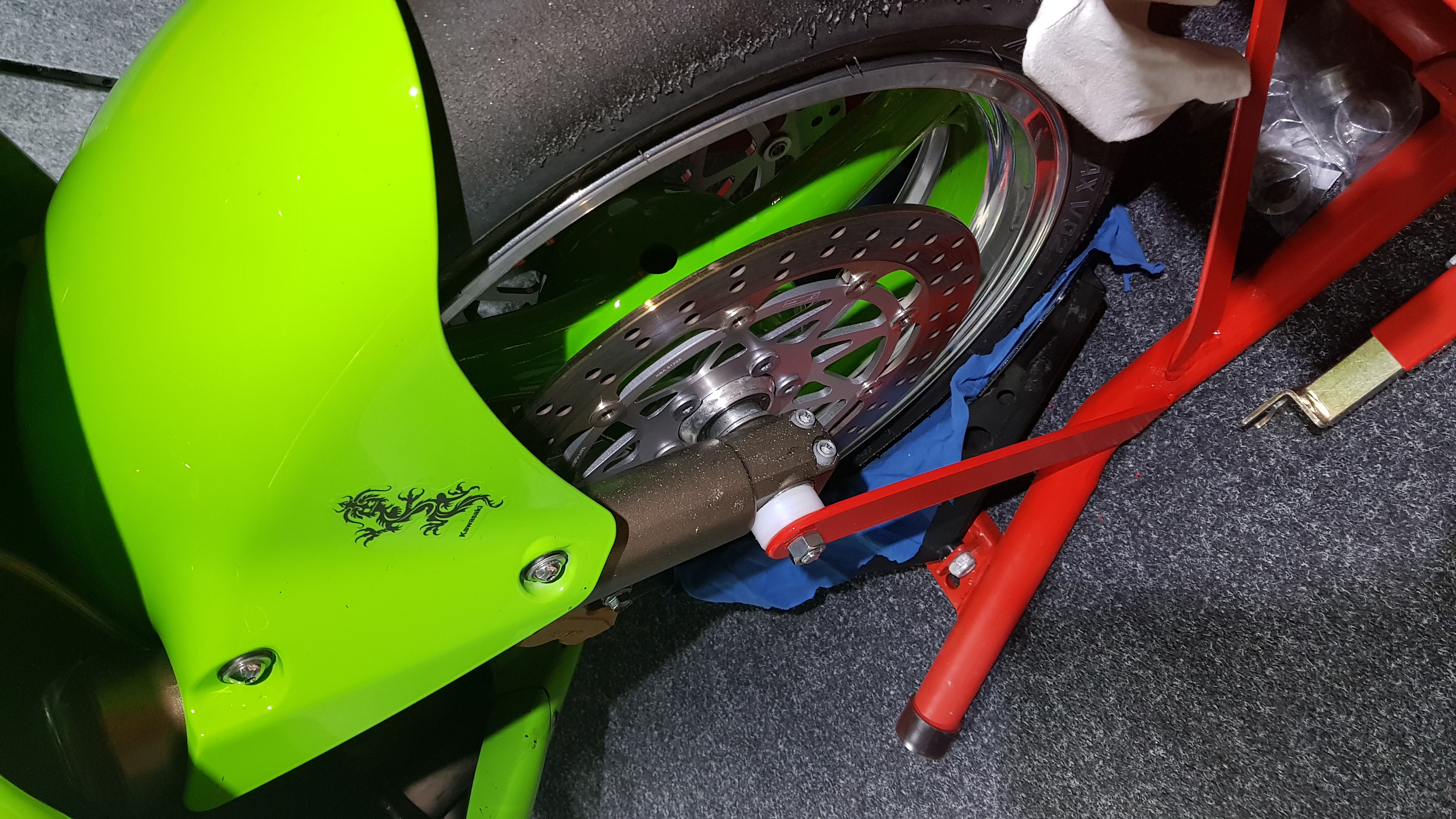 Ich habe an die Wippe 2 Flacheisen angeschweißt. Nachdem das Moped im Ständer steht, wird eine Gewindestange durch die Radachse gesteckt und verschraubt. Dann hinten noch ein Gurt über das Rad und fertig. Das Ganze geht ruck zuck und ist Bombenfest