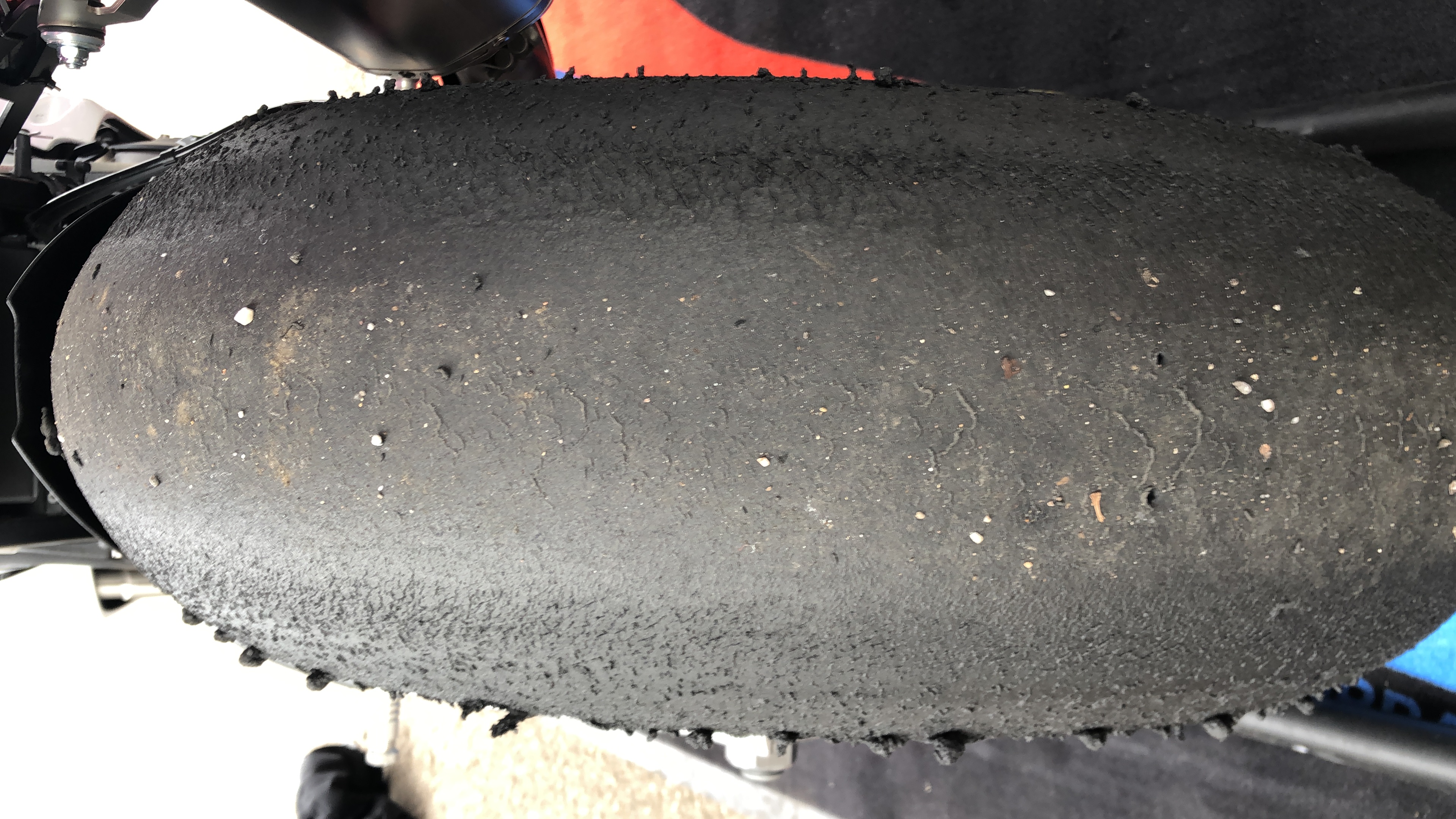 Den korrekten Luftdruck vorausgesetzt solltest du auch an deinem Fahrstil am Kurvenausgang arbeiten... so wie das Reifenbild aussieht reißt du beim aufrichten zu spät und arg das Gas auf. Lieber früher+ sanfter und konstant weiter beim aufrichten.