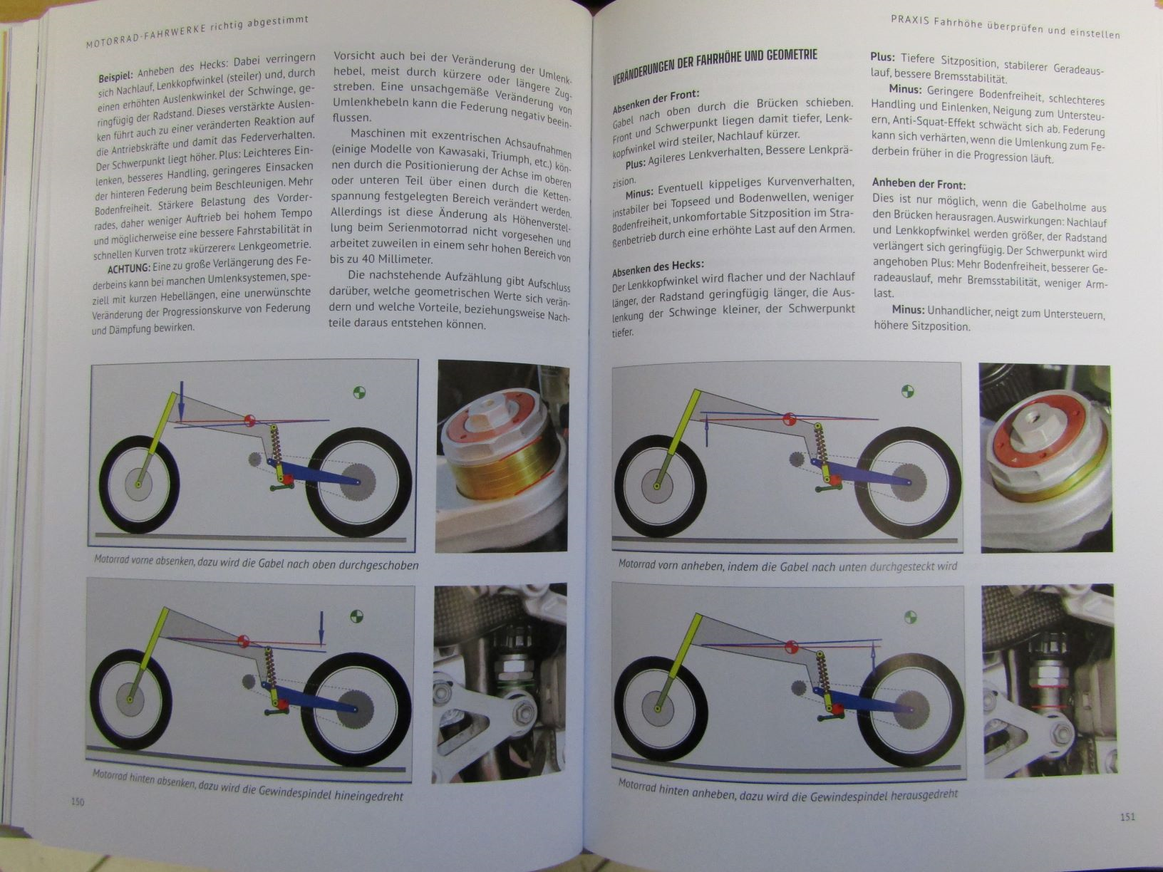 ich hab mal zwei Seiten aus meinem Fahrwerksbuch abfotografiert, damit du einen Eindruck über den Inhalt bekommst. Grundsätzlich zielen alle Kapitel, egal ob TECHNIK oder PRAXIS darauf, ab, dass man die Zusammenhänge von Dämpfung/Federung/Rahmen- und Lenkgeometrie versteht und mit gezielten Änderungen für ein besseres Fahrverhalten umsetzten kann, ohne dass man ein Maschinenbaustudium absolviert hat. Als Zusammenfassung gibts noch die Tabelle