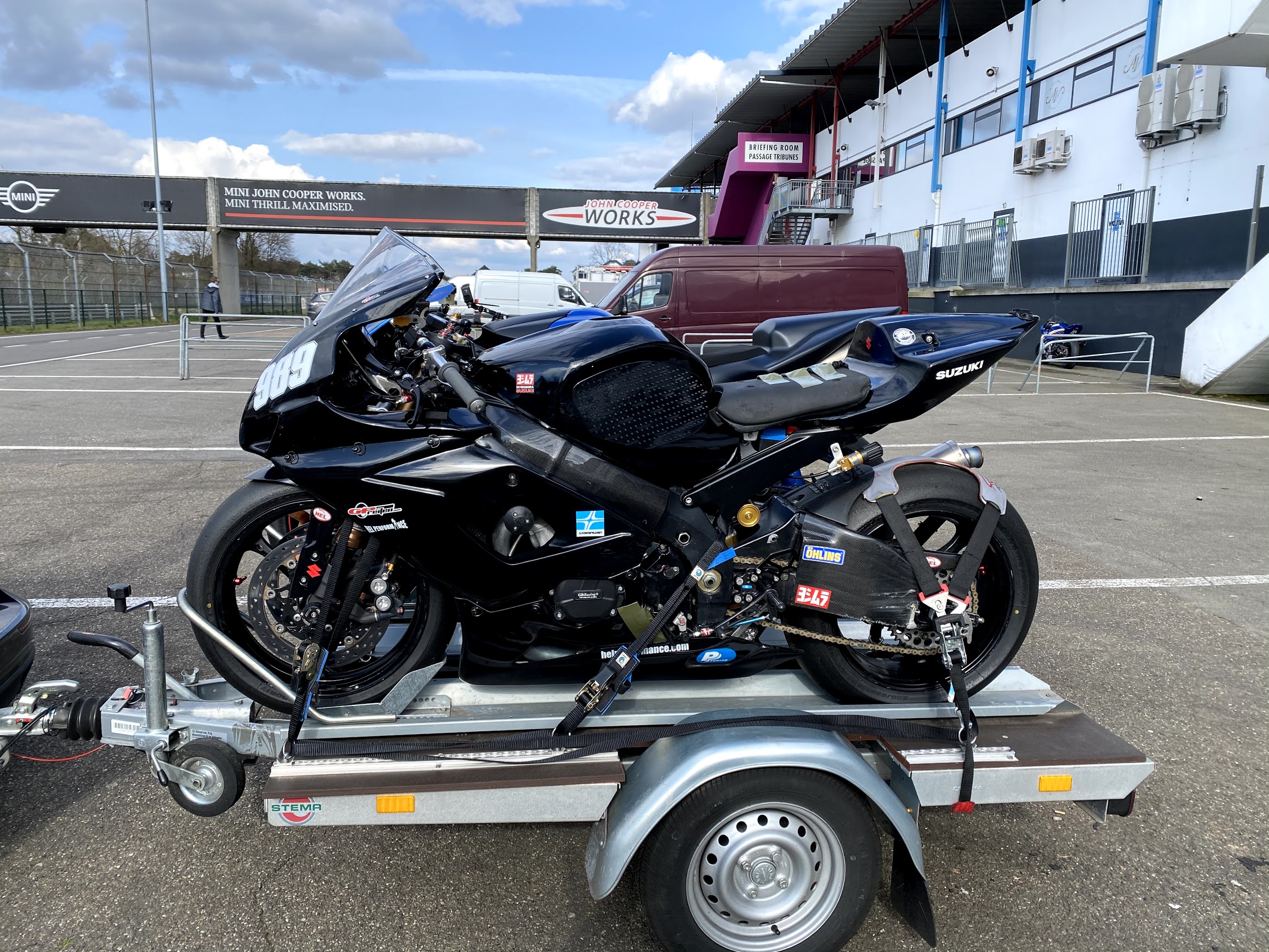 Das Heck des Motorrads ist ja am Hinterrad (im ungefederten Bereich) auf dem Hänger verzurrt. Da ist keinerlei Bewegung möglich.