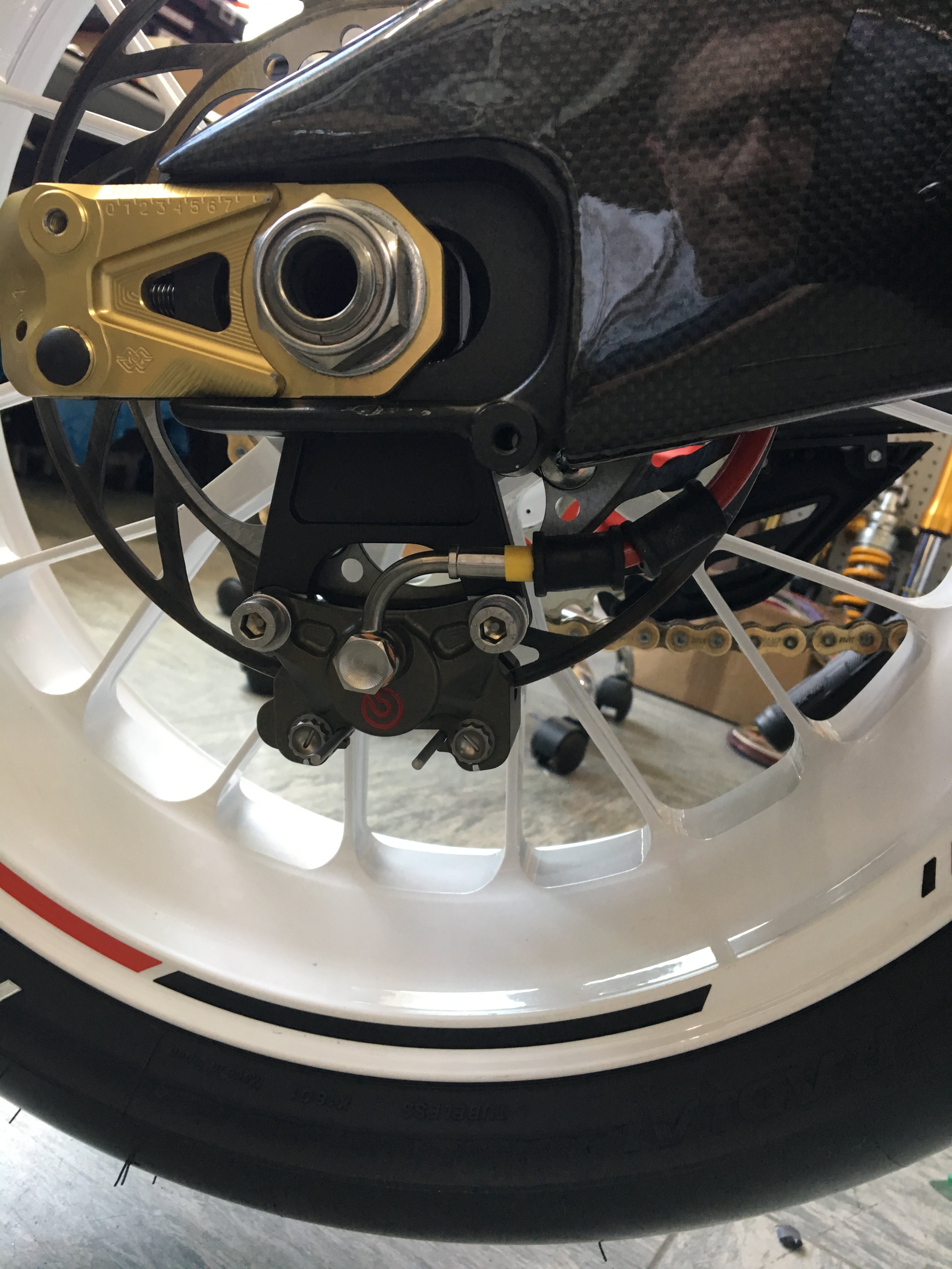 Aber eines interessiert mich doch: Warum setzt man den Bremssattel senkrecht nach untennund nicht gedreht weiter nach hinten in Richtung Schwingenlager? Das einfädeln der Bremsscheibe dürfte ähnlich einfach wie unten gehen, aber beim Einfädeln des Rads wäre noch mehr Platz. Durbahn hat mal so was für die CBR1000 gebaut, da war der Bremssattel unsichtbar hinter der Schwingenplatziert….