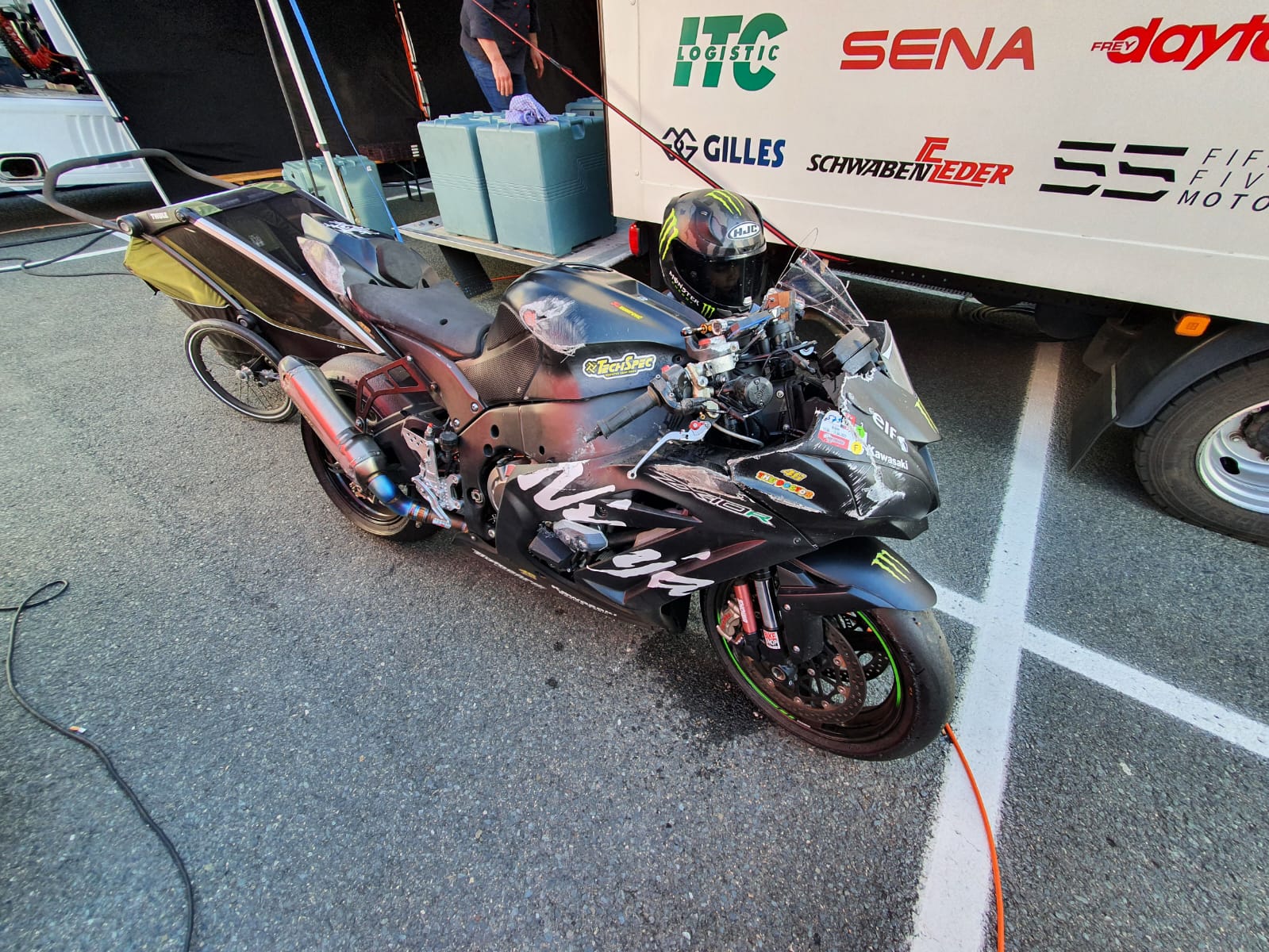 Da jetzt eh schon alles hinhüber war (inklusive der Schutzkleidung) dachte ich mir, machen wir es doch gleich richtig. Ich wollte eh schon lange mal weg von dem Mix aus Serienbike und paar Rennkomponenten hin zu nem richtigen Racebike. Daher wurde folgendes neu gemacht: