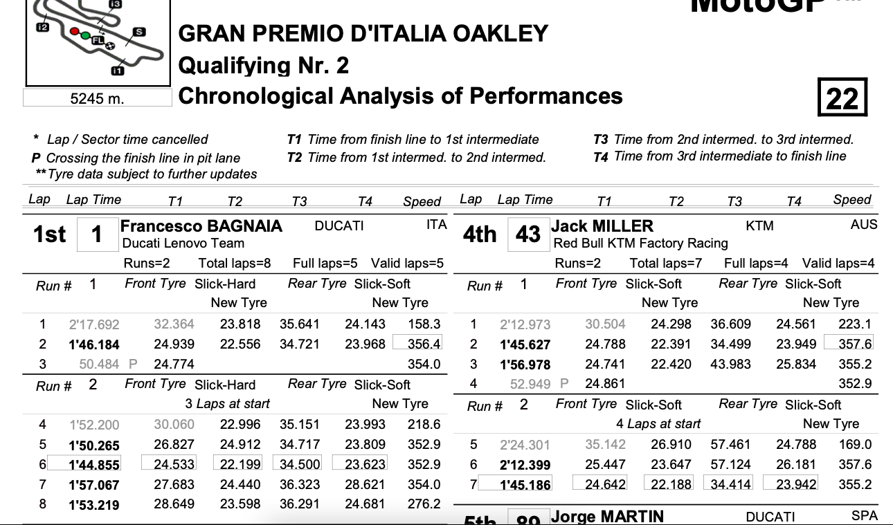 Ich habe doch den link zu den chronologischen Rundenzeiten vom Q2 geteilt, den muß man nur ansehen. Hier ein Sreenshot, als Beispiel Pecco (2.17.6) und Miller (2.12.9).