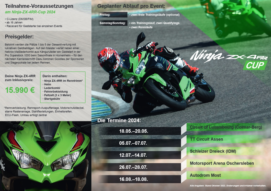 Für die nötige Aufmerksamkeit sorgen Kawasaki Deutschland sowie die Fachpresse. Außerdem macht der Ninja-ZX-4RR- Cup am Schleizer Dreieck im Rahmen des bestens besuchten IDM-Wochenendes Station.
