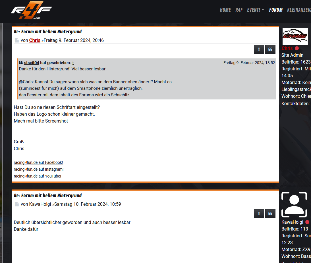 erschreckend ist, dass auf einem 14" Laptop in Full-HD eigentlich immer nur ein Beitrag angezeigt werden kann (der letzte von Chris) oder gerade mal die beiden vom Bramfelder und Kawa-Holgi zusammen, die im Prinzip aber nur eine Zeile geschrieben haben