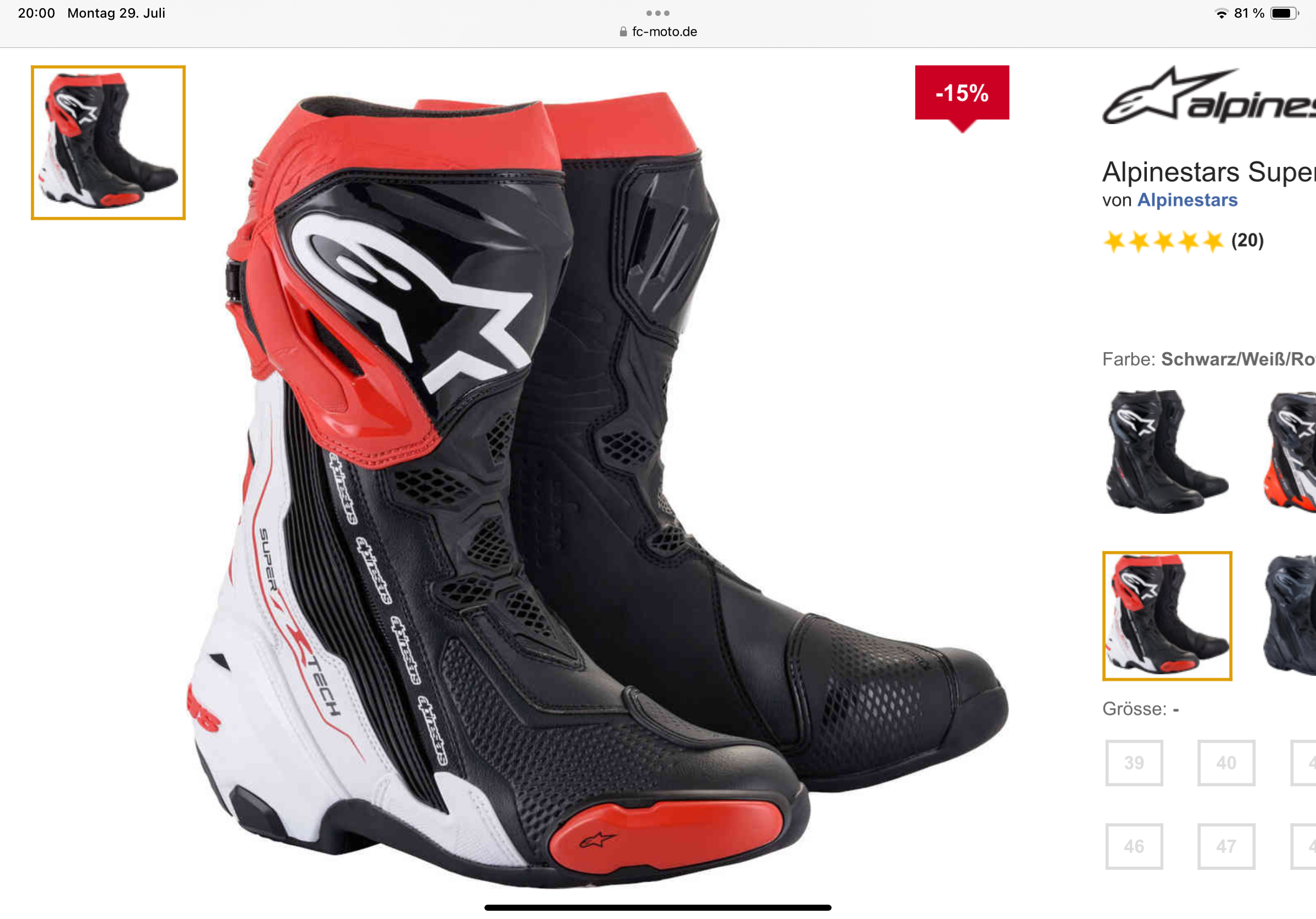 Ich möchte mir neue Alpinestars Supertech R Stiefel zulegen, ich habe schon welche, bin zufrieden, aber diese sind nach nun 14 Jahren durch.