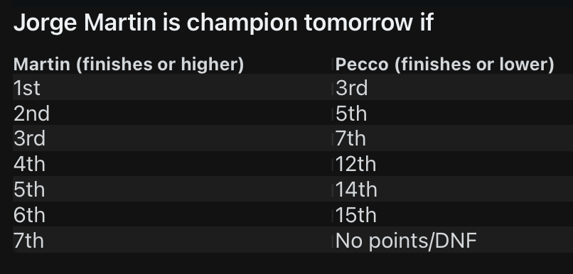 JM müsste morgen nen Nuller einfahren und Pecco gewinnen. Dann wäre zum Finale noch eine Chance.