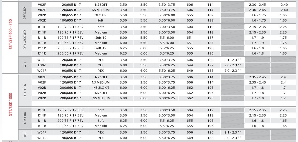 Kategorie, Reifentyp, Reifenmodell, Größe, Mischung, gemessene Felge (Zoll), Ideales Felgenmaß (Zoll) , zugelassene Felgenmaße (Zoll), Durchmesser Reifen (mm), gemessene Reifenbreite (mm), Druckbereich (kalt in bar), Druckbereich (heiß in bar), Zieldruck (heiß in bar)