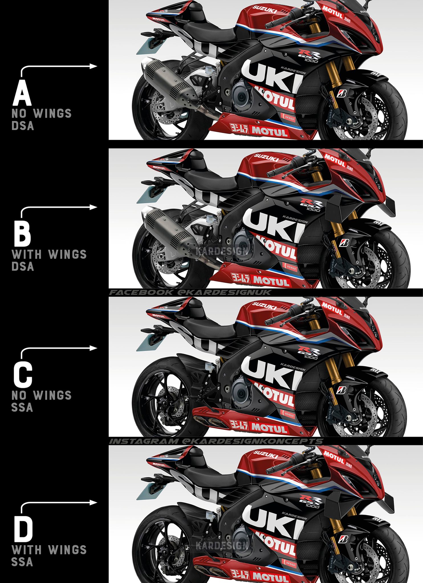 Der Typ hinter diesen Bildern ist Kardesign. An Fantasie fehlt es ihm nicht und seine Bilder werden von der Englischen Presse gerne verwendet, doch ich glaube kaum, dass Suzuki jemals Einarmschwingen oder Underengine-Auspuffe verbaut.