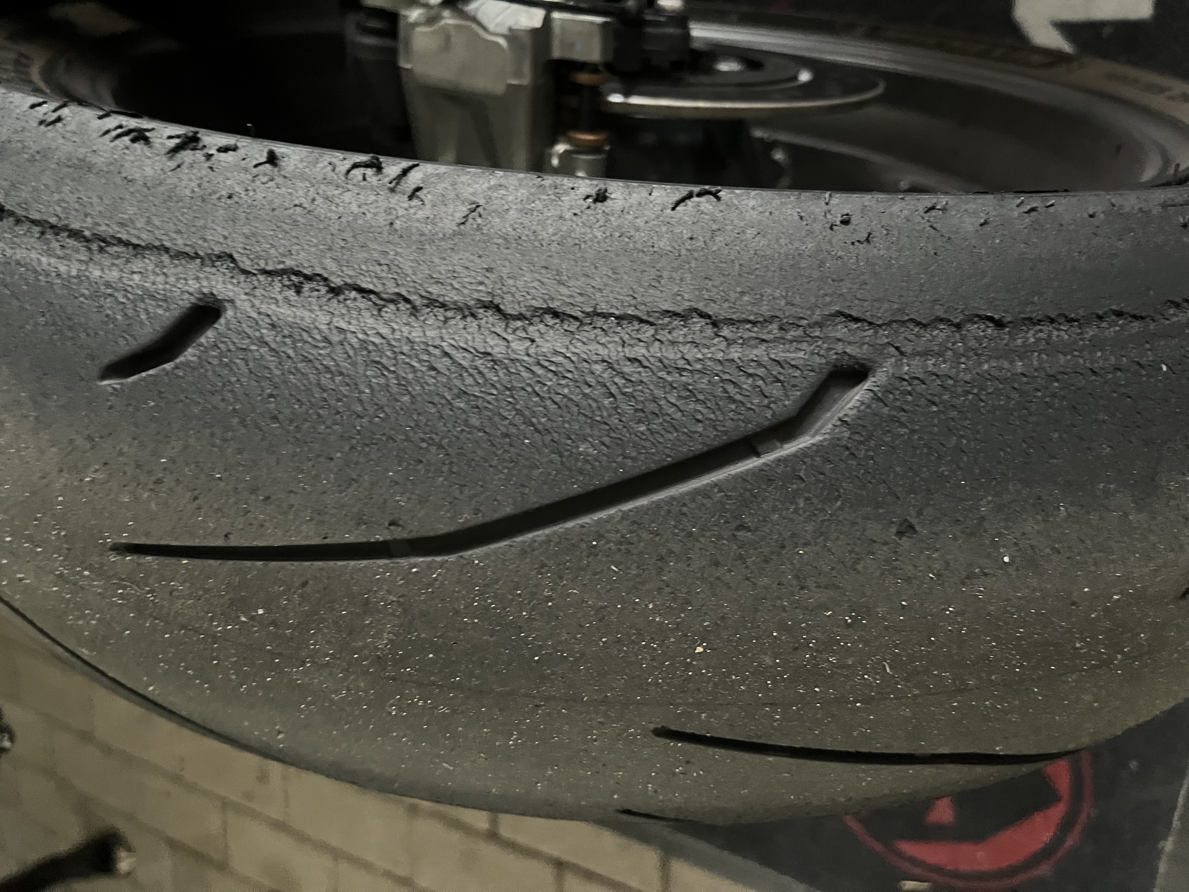 Da gibt es eine Menge Möglichkeiten die das auslösen/verstärken. Grundsätzlich neigt dieser Reifen eher dazu als ein Slick. Die Basis für das Reifenbild ist aber eine leichte unausgewogenheit in Richtung zu viel Zugstufe/zu wenig Druckstufe/evtl.zu weiche Feder. Hintergrund: Der Reifen hat in der Beschleunigungsphase in Schräglage (hier anscheinend ein rechtskurs) zu viel Schlupf, das erzeugt dieses "Aufreissen". Das Heck federt nicht schnell genug aus, übertrieben gesagt nimmt der Reifen die "negativwellen" nicht mit, eben wegen mangelnder "Abstützung" aus erstgenannten Möglichkeiten. Fang einfach erstmal mit Zugstufe aufdrehen an, wenns "pumpt" die Druckstufe ein bisschen zu, u.s.w. Feder kannst ja easy messen, delta zwischen negetiv Federweg mit und ohne Fahrer ca.