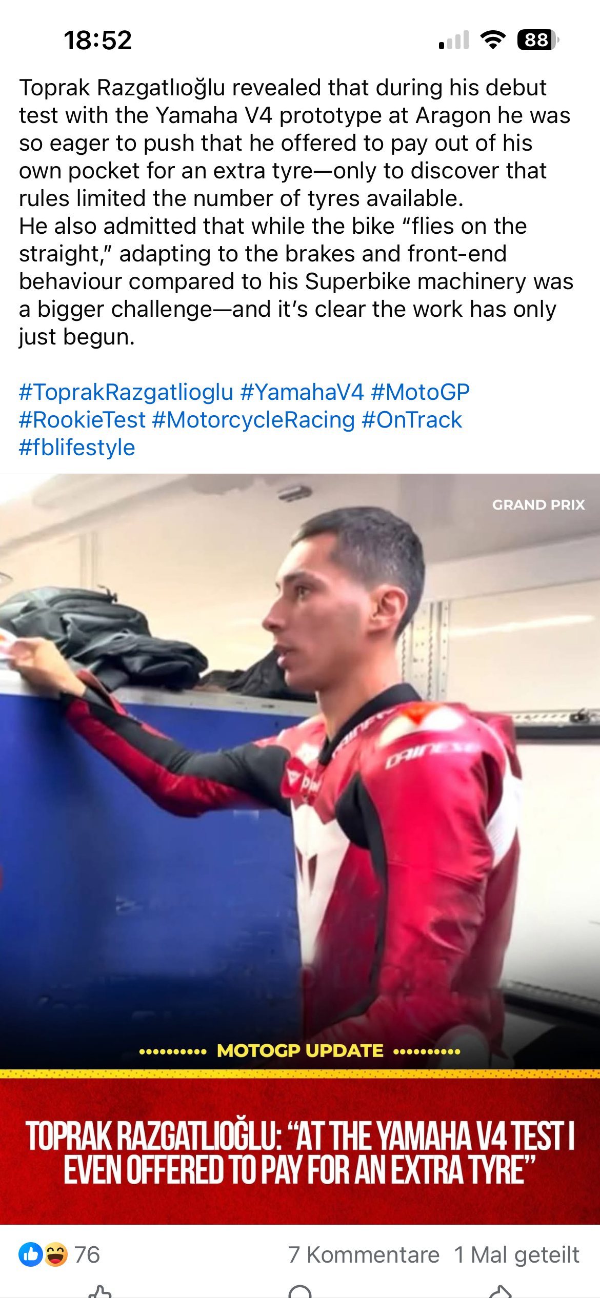".... Wer dachte die Hardcore-Gelbkapperl waren gaga, den werden TRs Fans eines besseren belehren. Wenn TR nicht performt wie gehofft, dann wird es mit den Verschwörungstheorien los gehen, im Sinne von, es ist nicht gewollt dass ein Türke wegen den Spaniern in der MotoGP gut ist.