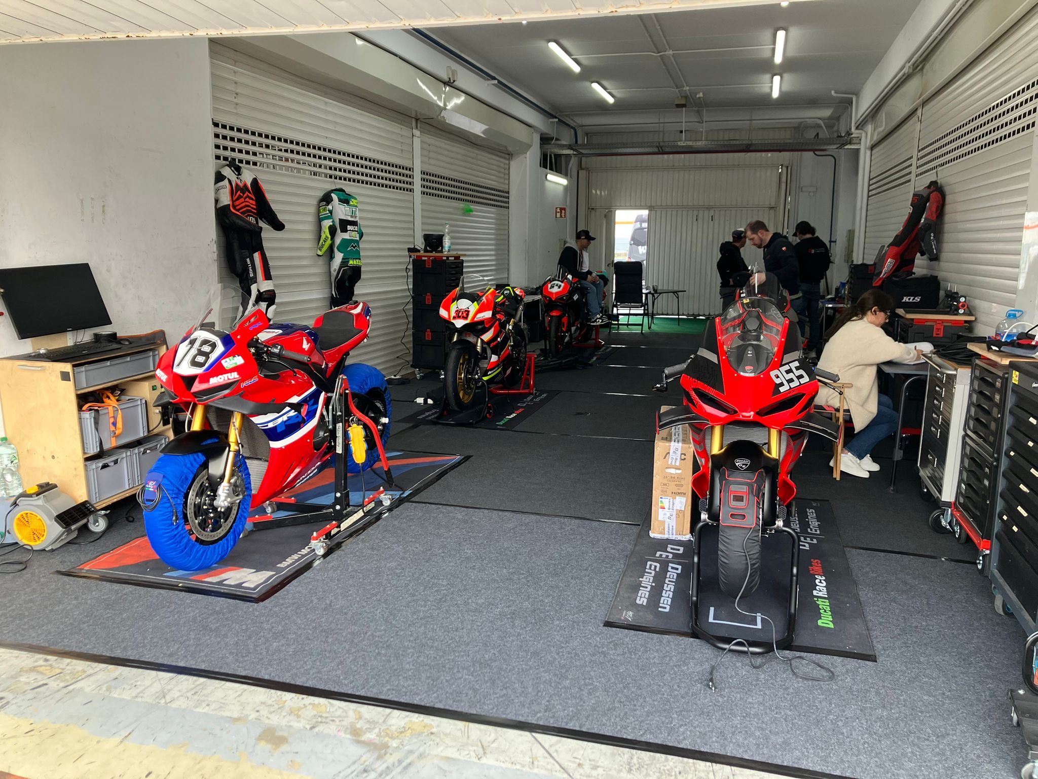 Erstmal wurde die Box bezogen - ich war der einzige auf Honda, alle anderen waren auf 2 oder 4 Duc-Zylindern unterwegs. Unser Boxenchef gleich mit einer V4R und einer V4S. Na gut, als _der_ Ducati Tuner gehört das wohl dazu ;) Die Honda durfte sogar mit aufs Bild ;)