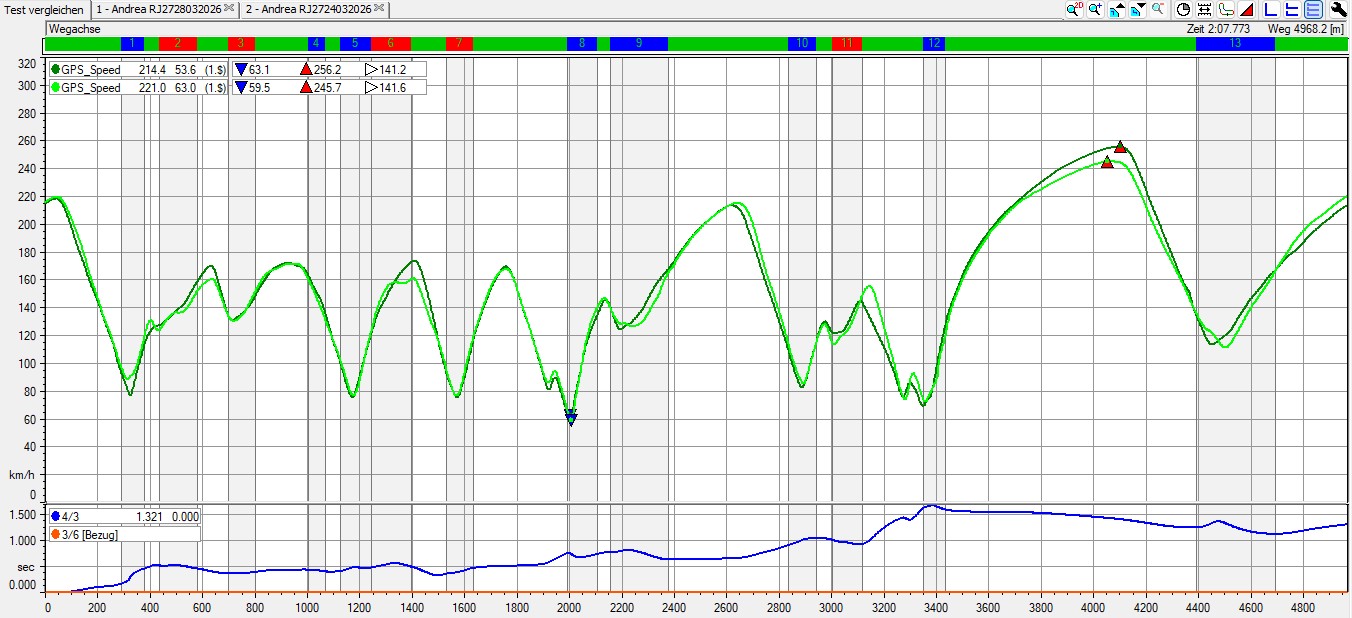gut zu sehen erste Kurve... hellgrün ... schneller durch daher Zeit gewonnen... kannst direkt mitm Zeiger dorthin dann siehst das V Delta