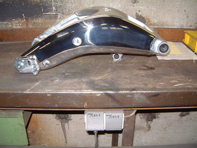 Also musste umgehend die Schwinge der Mille her. Dieses Teil war unter den Milletreibern aber schwerstens begehrt, da jeder Umfaller, ob bei voller Fahrt oder im Stand, zu unschönen Verformungen derselben führten. Wochenlang habe ich ebay abgegrast, um ein makelloses Teil zu schießen. Nix war. Nur Schrott wurde angeboten. Na gut dachte ich, dann nimmste eben für 35 Öken den Schrott und feudelst mal ´n bischen drüber.