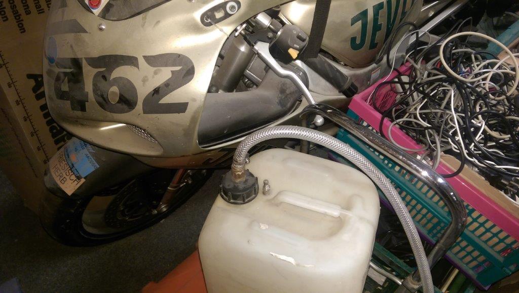 Ich hatte jahrelang, auch um meine Faulheit zu vervollkommnen, meinen Kompressor über einen modifizierten Verschluss an den Behälter angeschlossen und über einen zweiten Schlauch daneben Treibstoff in die Gixxer gepumpt. Man musste rechtzeitig abschalten doch konnte ich eigentlich gut dosieren.
