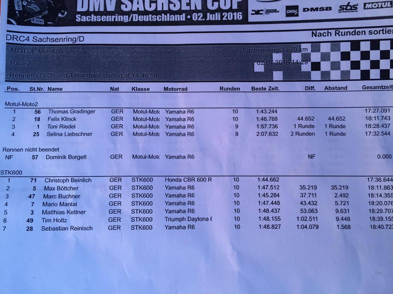 Das Wetter wurde immer unbeständiger, wir drehten nur den Hinterreifen und erwarteten jede Sekunde Regen. Allerdings blieb es trocken. Nach einem guten Start fuhren Buchner und Gradinger vorn weg. Tim und Christoph starteten mit mir eine kleine 3er Gruppe. Als Tim sich verbremste und wenige Meter durchs Kies musste, war er hinter uns. Ab Rennmitte hatte ich hinten keinen Grip mehr links herum und musste nicht nur Christoph ziehen lassen, sondern auch noch Dominik Borgelt ( Moto2-Wertung) nach einem Motorrad-Körper-Kontakt ziehen lassen. Gradinger schied mit Defekt aus und ich kam somit als 3. in der STK600 Wertung ins Ziel.