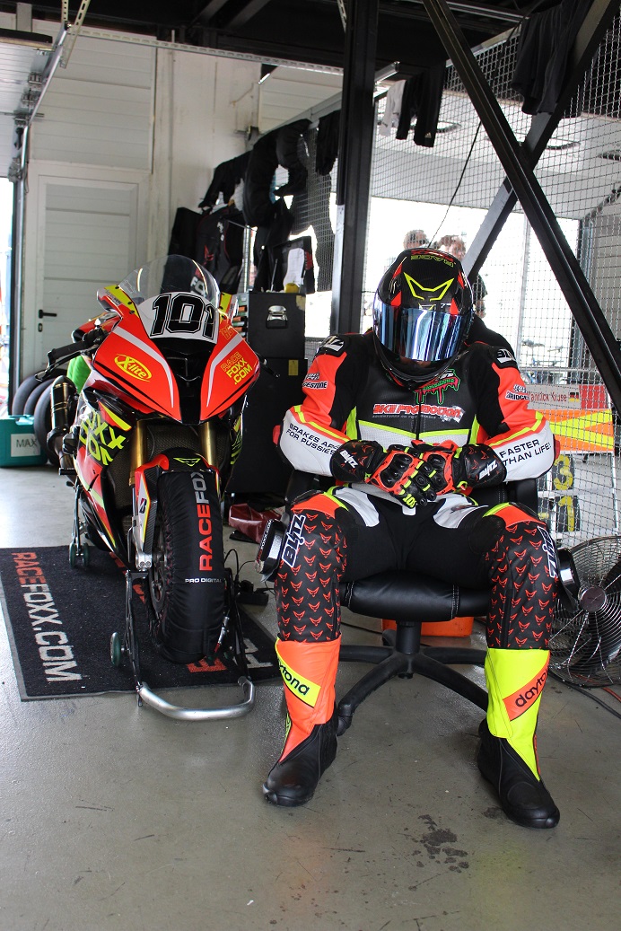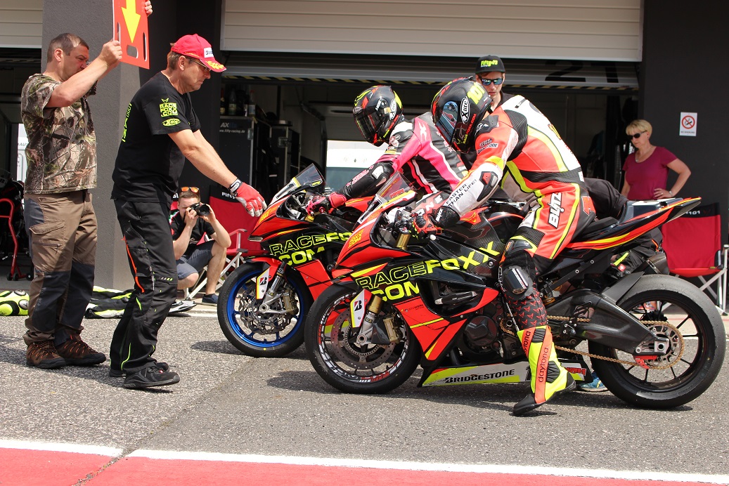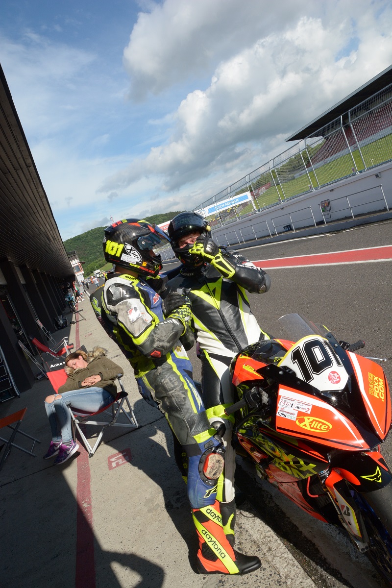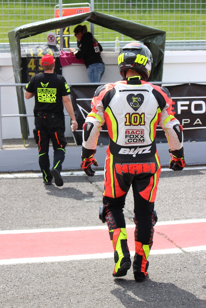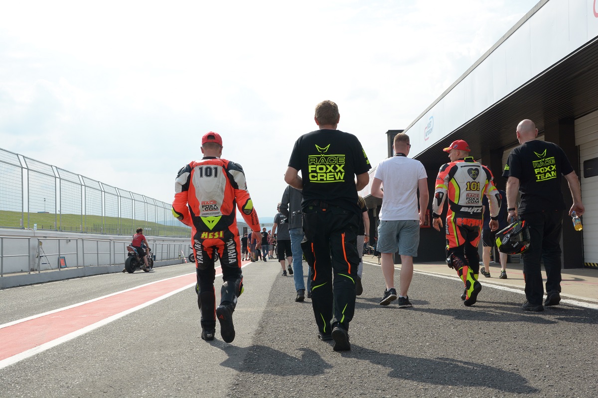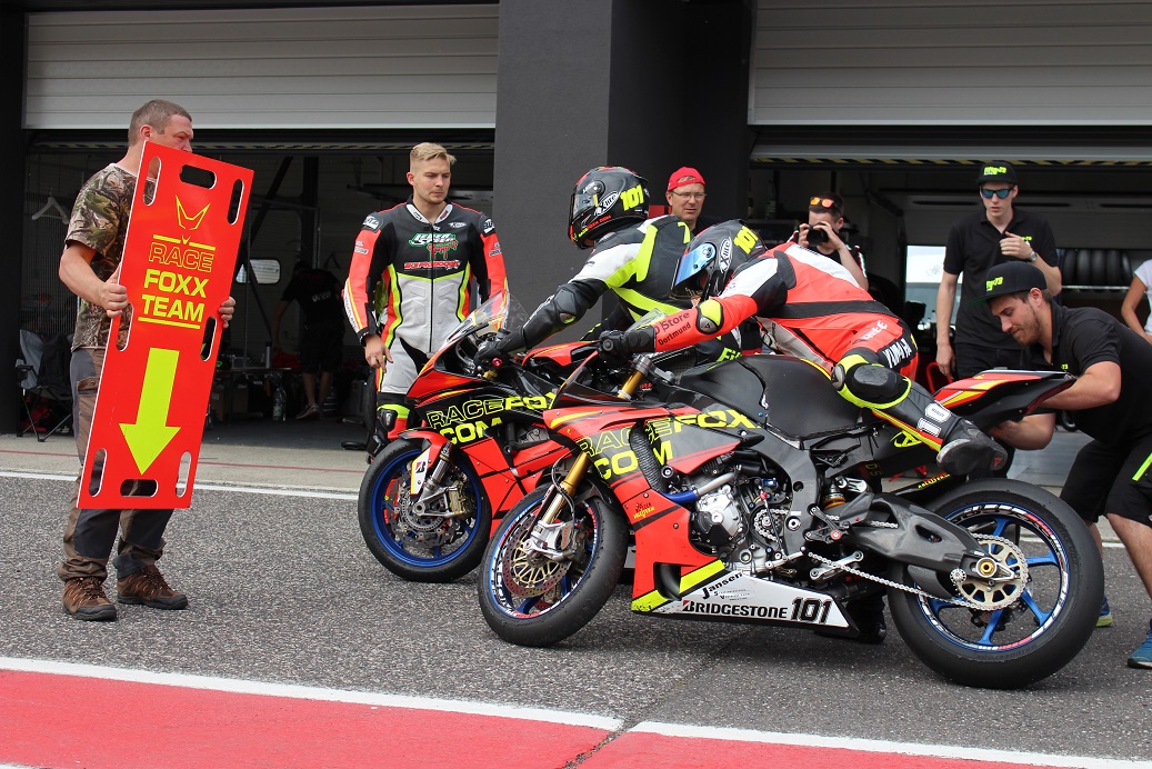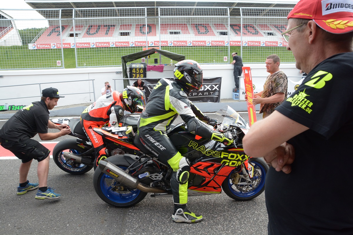 Die ganze Nacht regnete es ununterbrochen und der heutige Sonntag stand absolut im Schatten des Wetters, welches immer wieder heftige Regenschauer für uns bereit hielt. Stefan "Hesi" Hesterberg und Fifty#73 Racing komplettierten das Trio des Racefoxx.com Teams. Das Quali wurde im Regen ausgetragen. Fifty brannte unfassbar gute Zeiten in den Asphalt und fühlte sich pudelwohl. Nach einem Abbruch ging Hesi auf die Strecke und schippte paar 102 Oktan Kohlen in den Brennraum der R1 und konnte ebenso mit guten Zeiten nachlegen. Abbruch Nummer 2 folgte ... Ich war der Letzte im Bunde und die Strecke trocknete immer mehr ab. Nachdem im Training vorher nicht wirklich was ging, gewann ich immer mehr Vertrauen und kam 8min vor Ende des Qualis nochmal in die Box. Aktuell waren wir bei 1:57min durch fifty.... ich fuhr 2:01min... ich war damit schon zufrieden aber Fifty verpasste mir noch ein paar wichtige Worte und ließ mich das Risiko erhöhen. Ich konnte noch 2 schnelle Runden drehen und kam mit einer Zeit von 1:55min über die Linie. In Anbetracht der viel besseren Streckenverhältnisse ist die Zeit aber kein Wunder. Ich frage mich immer noch, wie man im Regen so fix sein kann wie Fifty und Hesi. Beides keine Regengötter, entdeckten diese heute ein wenig Freude und Vertrauen zum nassen Untergrund.