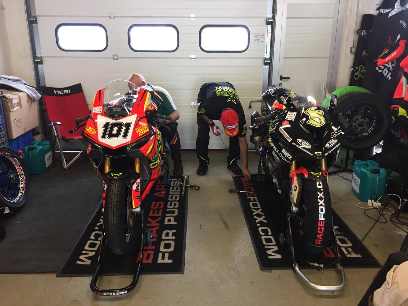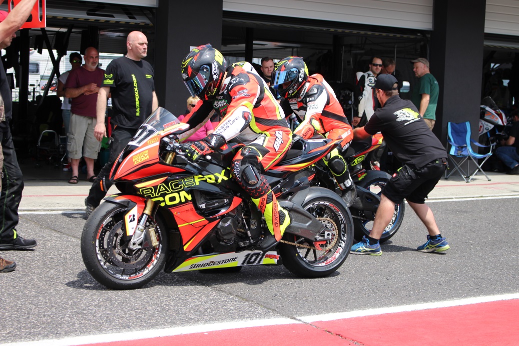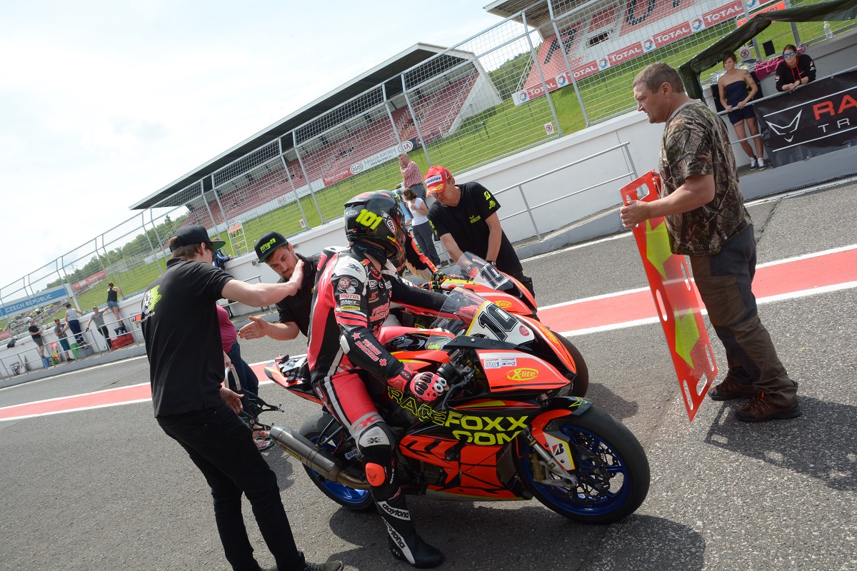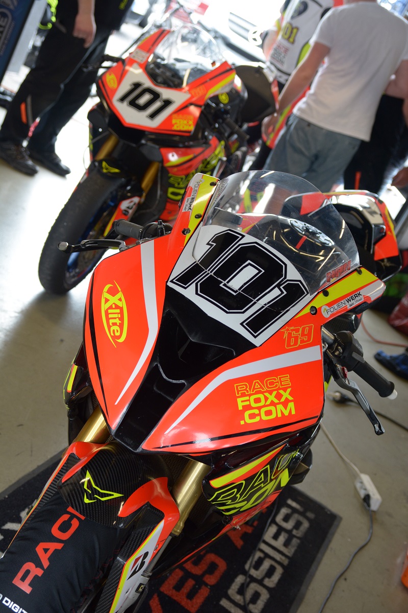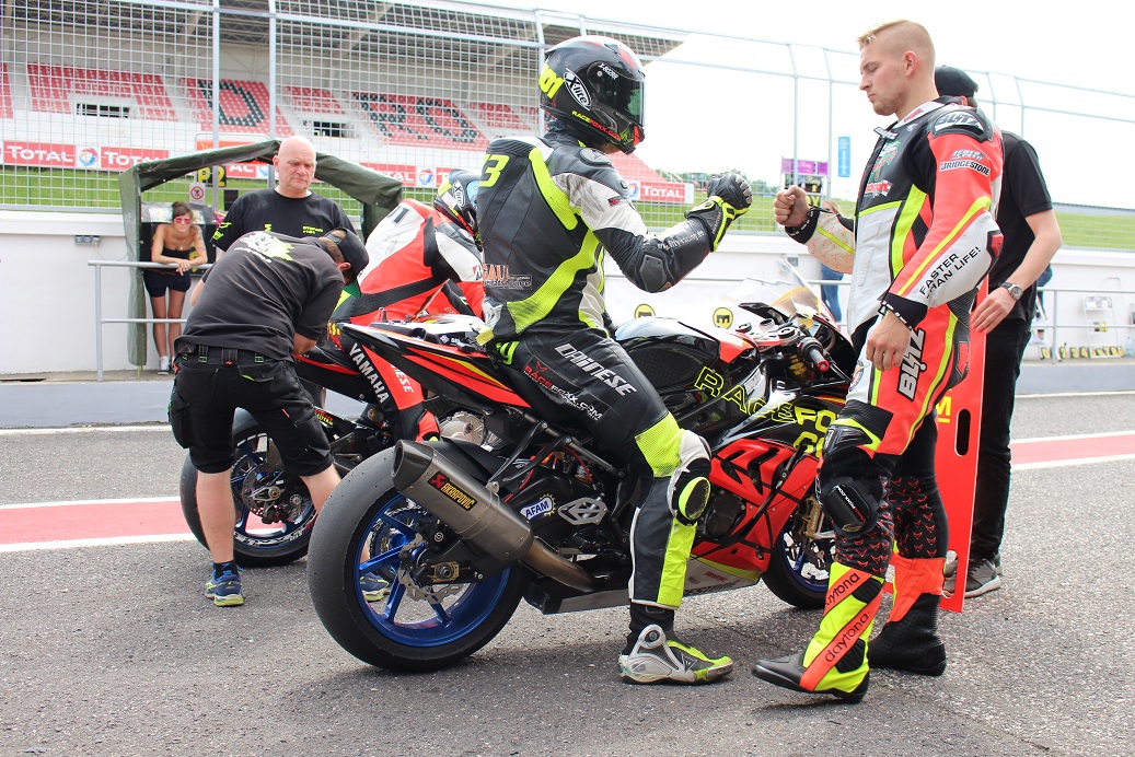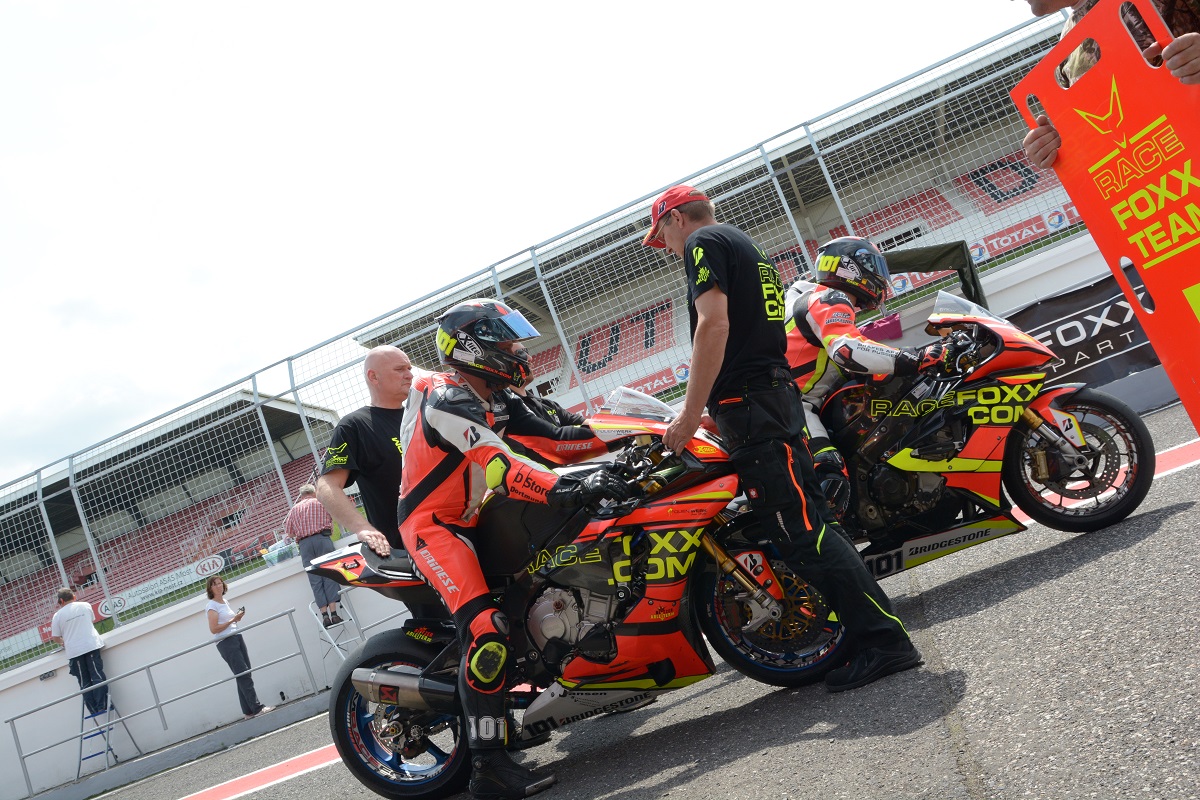 Die ganze Nacht regnete es ununterbrochen und der heutige Sonntag stand absolut im Schatten des Wetters, welches immer wieder heftige Regenschauer für uns bereit hielt. Stefan "Hesi" Hesterberg und Fifty#73 Racing komplettierten das Trio des Racefoxx.com Teams. Das Quali wurde im Regen ausgetragen. Fifty brannte unfassbar gute Zeiten in den Asphalt und fühlte sich pudelwohl. Nach einem Abbruch ging Hesi auf die Strecke und schippte paar 102 Oktan Kohlen in den Brennraum der R1 und konnte ebenso mit guten Zeiten nachlegen. Abbruch Nummer 2 folgte ... Ich war der Letzte im Bunde und die Strecke trocknete immer mehr ab. Nachdem im Training vorher nicht wirklich was ging, gewann ich immer mehr Vertrauen und kam 8min vor Ende des Qualis nochmal in die Box. Aktuell waren wir bei 1:57min durch fifty.... ich fuhr 2:01min... ich war damit schon zufrieden aber Fifty verpasste mir noch ein paar wichtige Worte und ließ mich das Risiko erhöhen. Ich konnte noch 2 schnelle Runden drehen und kam mit einer Zeit von 1:55min über die Linie. In Anbetracht der viel besseren Streckenverhältnisse ist die Zeit aber kein Wunder. Ich frage mich immer noch, wie man im Regen so fix sein kann wie Fifty und Hesi. Beides keine Regengötter, entdeckten diese heute ein wenig Freude und Vertrauen zum nassen Untergrund.