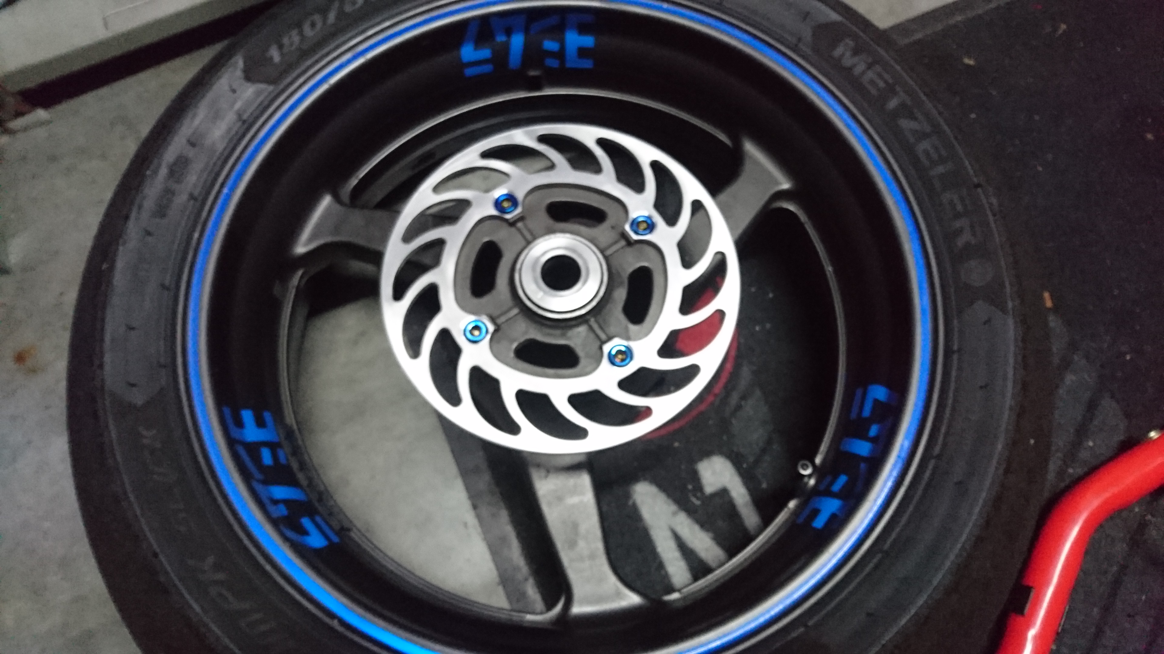 Die Bremsscheibe habe ich mir aus einem 5mm Aluminiumblech rauslasern lassen mit etwas Aufmaß. Anschließend habe ich einen Adapter angefertigt um die Bremsscheibe auf der Drehmaschine zu bearbeiten. Die Löcher wurden gebohrt/gesenkt und die Innenpassung bearbeitet. Auf den ersten Blick sieht das garnicht mal so schlecht aus, den Test auf einem Privatgelände hat Sie auch hinter sich und sieht gut aus (so wie bei diesem Test wird Sie wohl nie wieder benutzt :D ). Sieht schick aus und ist 625gramm leichter.