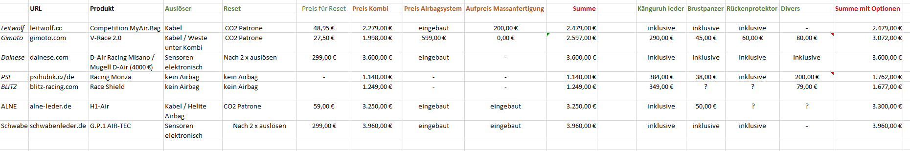 Ich habe eine ähnliche Liste wie du oben, meine Entscheidung fällt auf Leitwolf mit Airbag. Das verwendete Helite System macht für mich den besten Eindruck.