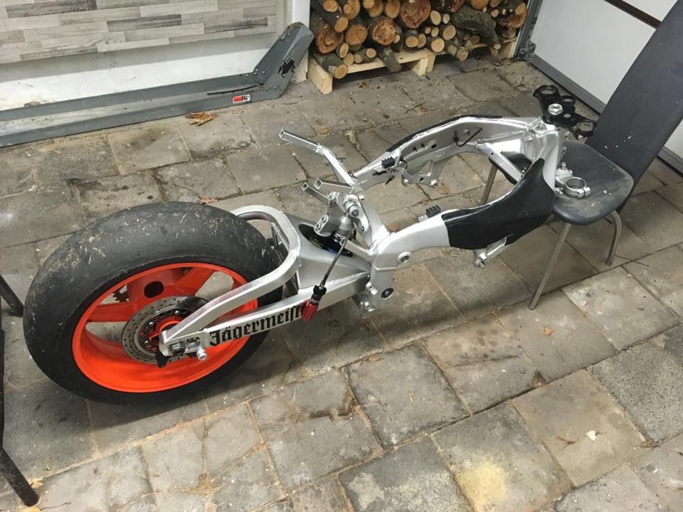 Dann kam die Schwinge zusammen mit Federbein an den neuen Rahmen.