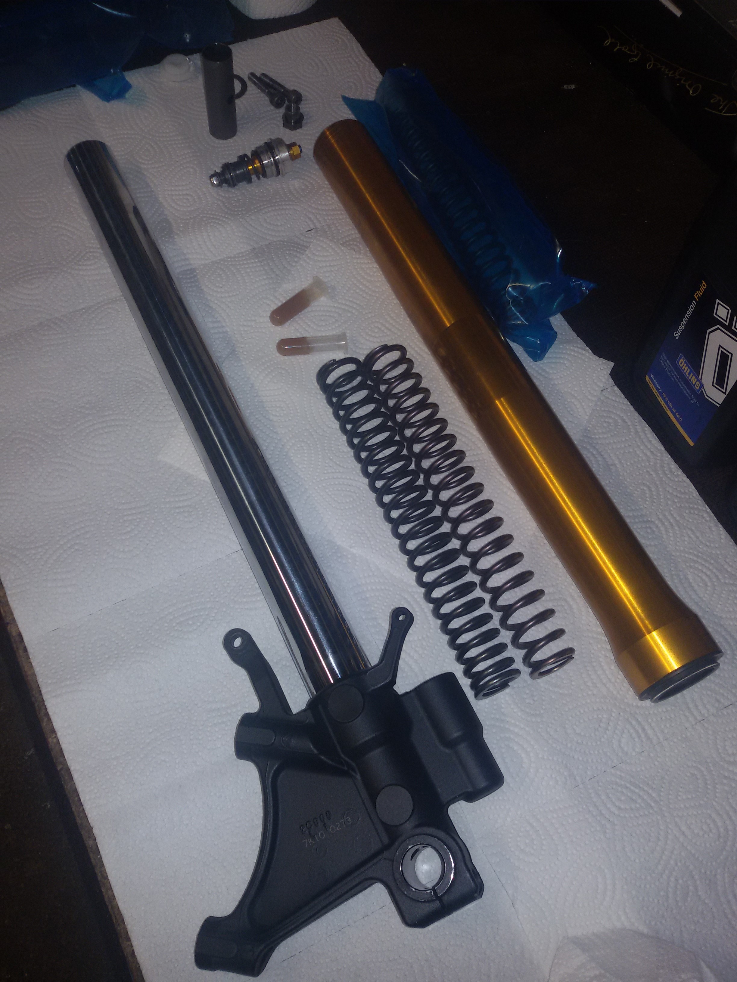 Also neue 9,5er Öhlinsfedern, SKF Simmerringe und Öhlins 01309 Öl mit 100mm Luftkammer rein. "Schonmal vorweg, die Gabel funktioniert so schon wirklich gut!"