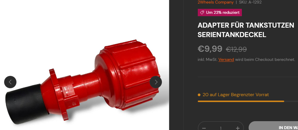 Was ist das für ein Adapter auf dem Bild? Seit dem Wechsel von der RSV4 auf die RN65 passen weder meine Tuff-Jug, noch meine 24MX Kanister. Das Blech im Tank habe ich entfernt, leider haben alle mir bekannten Racing Tankdeckel ebenfalls einen zu geringen Durchmesser. Den Adapter von Tuff-Jug habe ich, aber auf die Stopp Funktion beim befüllen möchte ich nicht verzichten.