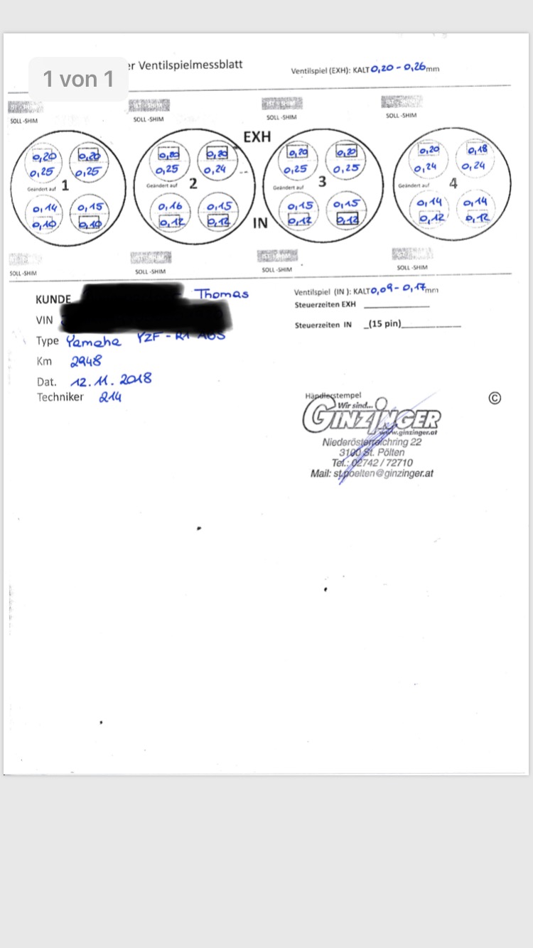 Auf dringendes Anraten des Ginzinger Mechanikers habe ich dann die Ventile kontrollieren lassen. Die sind dann auch neu eingestellt worden da sie laut ginzinger außerhalb der toleranz waren ( was ja auch das vermutete Problem und grund für die ganze aktion war).