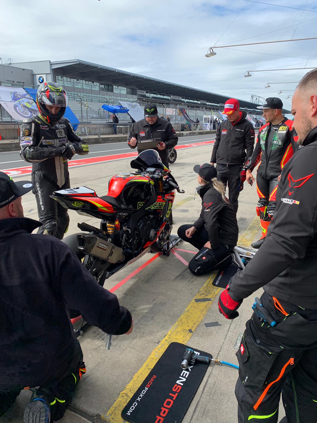 Das Rechnen begann. Vorsprung auf Viva stieg aufgrund unserer guten Wechsel und Peris Rausfahren des Vorsprungs gegenüber Fahrer 3 von Viva, Rüdiger Hauß, knapp 50sek. Wir warteten genau ab, wann Philipp Becker von Viva die RSV4 übernahm, schickten dann Hesi raus und er konnte trotz Klagen über seine Fitness den Vorsprung verwalten und uns den 1. Sieg einfahren. :band: