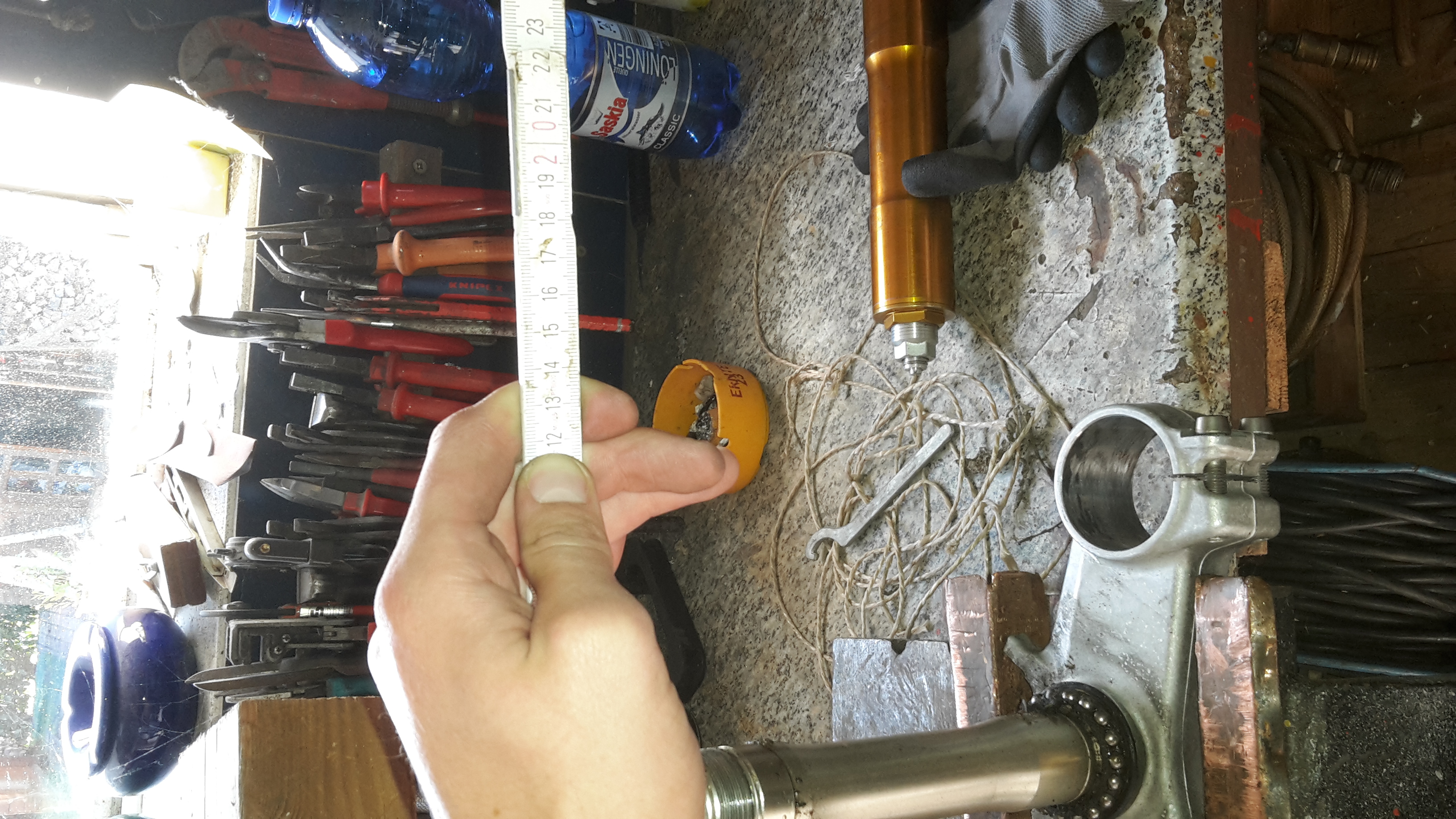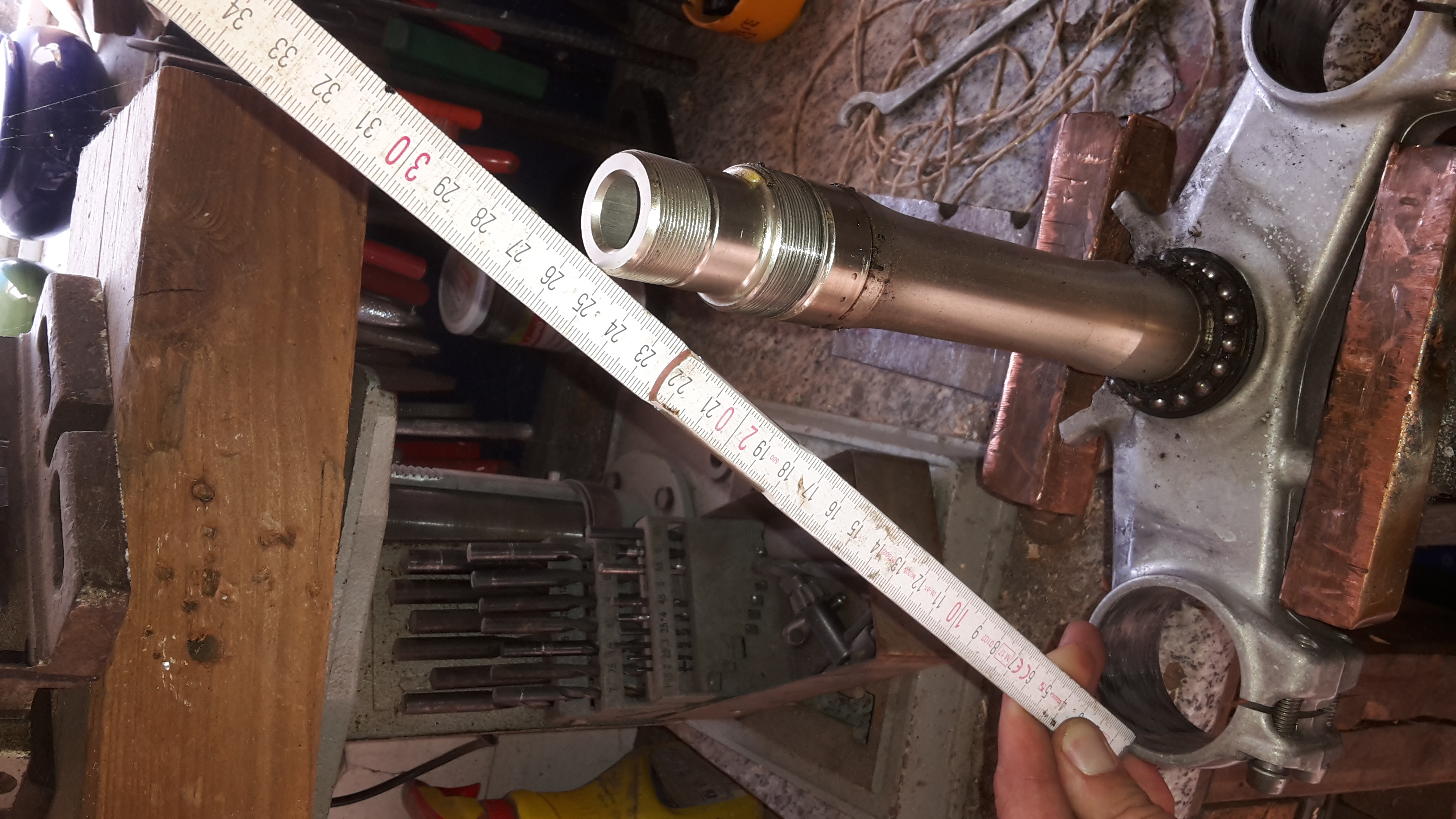 Als nächstes habe ich dann die untere Gabelbrücke samt Lenkstange ausgebaut und an zwei stellen vermessen: erstes Bild Abstand Lenkstange zum Holm (nur angedeutet, da ich zum Foto machen schon wieder den Holm raus hatte). Der Abstand passt auf beiden Seiten.
