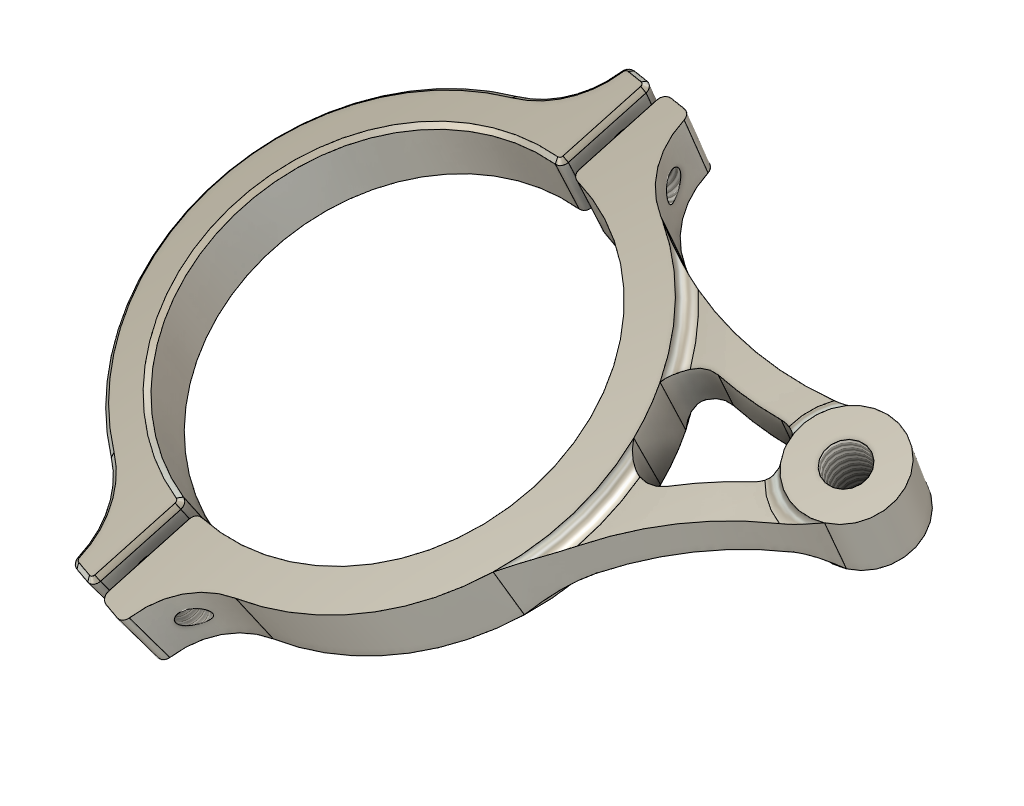 Anfangs hatte ich gedacht ich würde das ganze als ein Teil machen, also mit nur einer Klemmstelle, Wäre zwar einfacher zu fertigen, aber natürlich absolut bescheiden zu montieren, wenn man immer den Gabelholm ausbauen muss. Daher ist die Schelle nun zweigeteilt. Dabei habe ich die Klemmung asymetrisch versetzt, sodass die Klemmschrauben leicht seitlich zu erreichen sind, auch wenn die Lenkungsdämpferbefestigung gerade nach vorne zeigt.