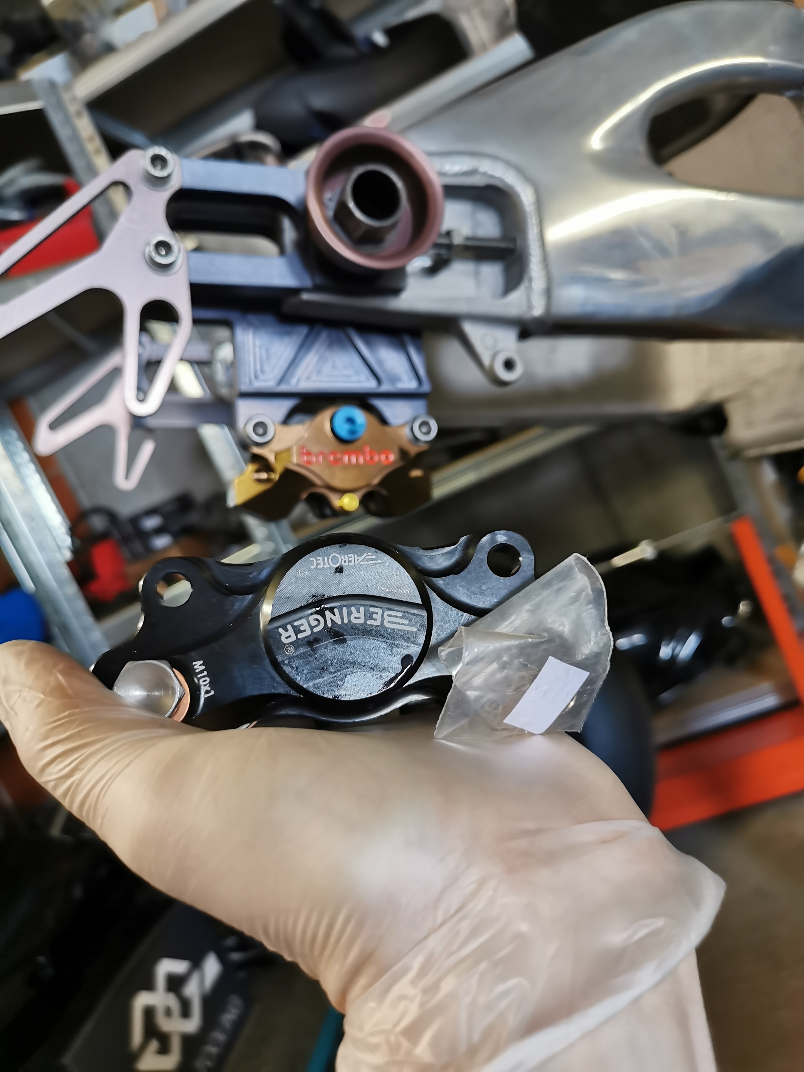 Und damit es wieder ein kleines Update gibt: Beringer bietet mittlerweile zwei Arten von Hinterradsätteln an. Wenn ich die Tage unbemerkt die Küchenwage stehlen und missbrauchen kann, dann werde ich natürlich auch mal wiegen. Der größere Sattel hat quasi die doppelte Belagfläche und entsprechend größere Kolben, ich habe mich aber für den kleineren entschieden. Geringere ungefederte Masse und ich bremse eh kaum hinten... Ich konnte aus dem Bestand von SERT Siegen auch weitere Teile kaufen, die ich noch anpassen und montieren werde.