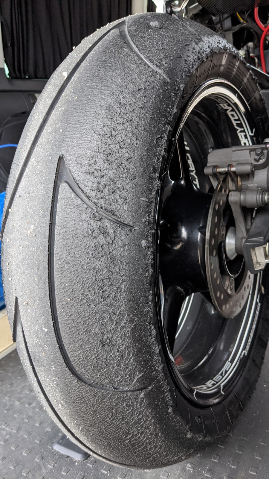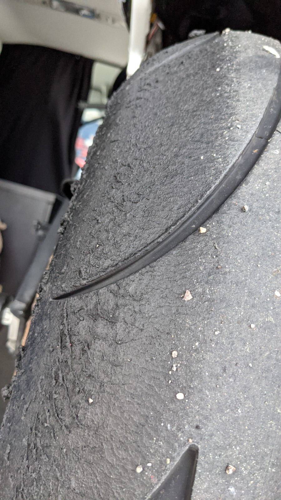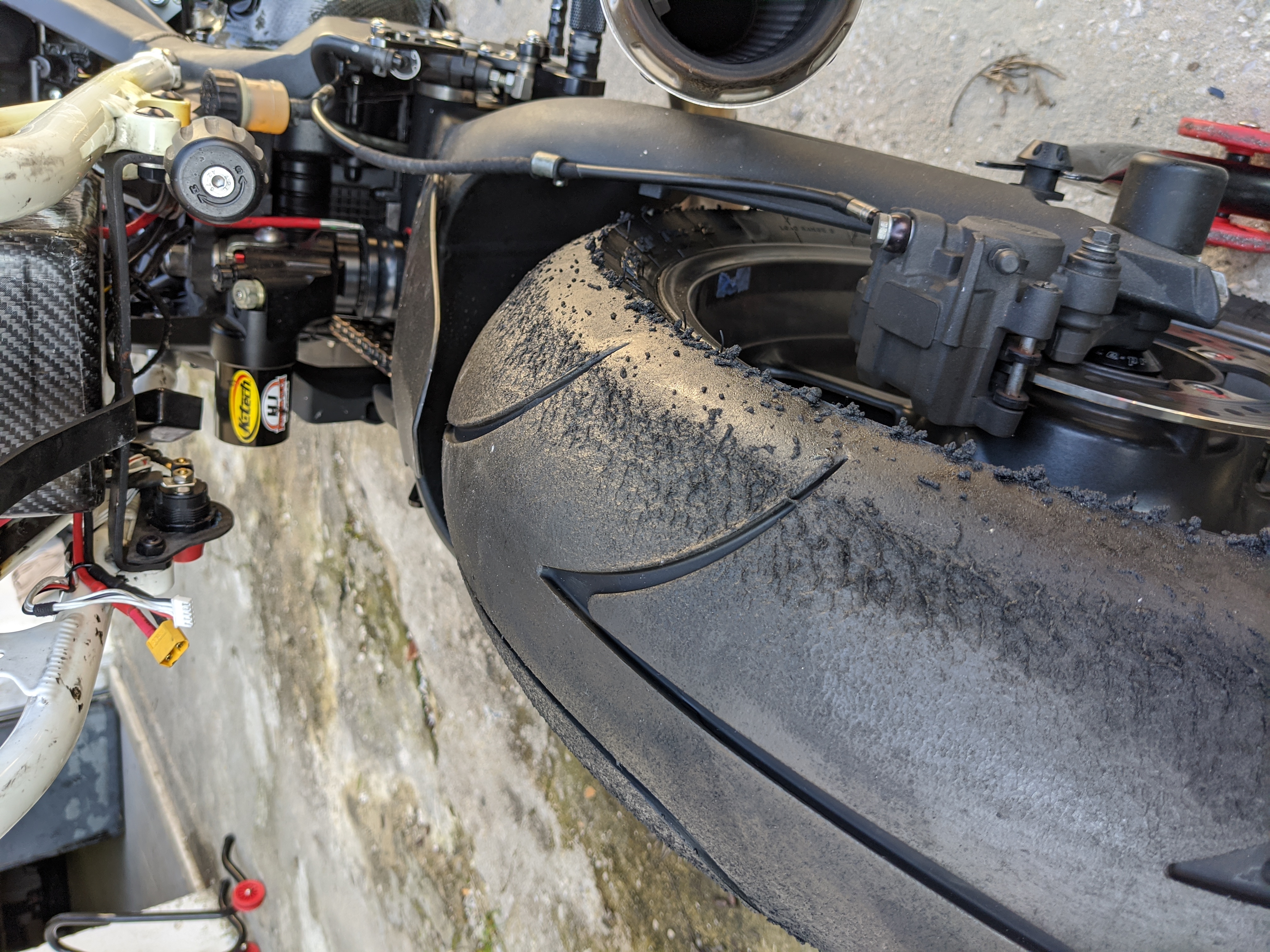 Hab daher Druckstufe 1 Klick hinten zu gemacht und Bypass 1 Klick zugemacht, um dem entgegen zusteuern (K-Tech 35DDS Bypass Einsteller, geht wohl gleichermassen auf Druck und Zugstufe im Low-speed Bereich). Resultat dass das Moped definitiv stabiler liegt, aber ich auch einen kleinen Highsider hatte (den ich gluecklicherweise irgendwie gestanden habe), in Kurve 3 wo das Hinterrad abrupt rumgekommen ist. Muss aber sagen das war ganz am Ende, da sah der Reifen schon so aus wie auf den folgenden Bildern, wahrscheinlich ist er einfach fertig. Da wo ich meinen Daumen hinhalte ist das Profil bei 0.