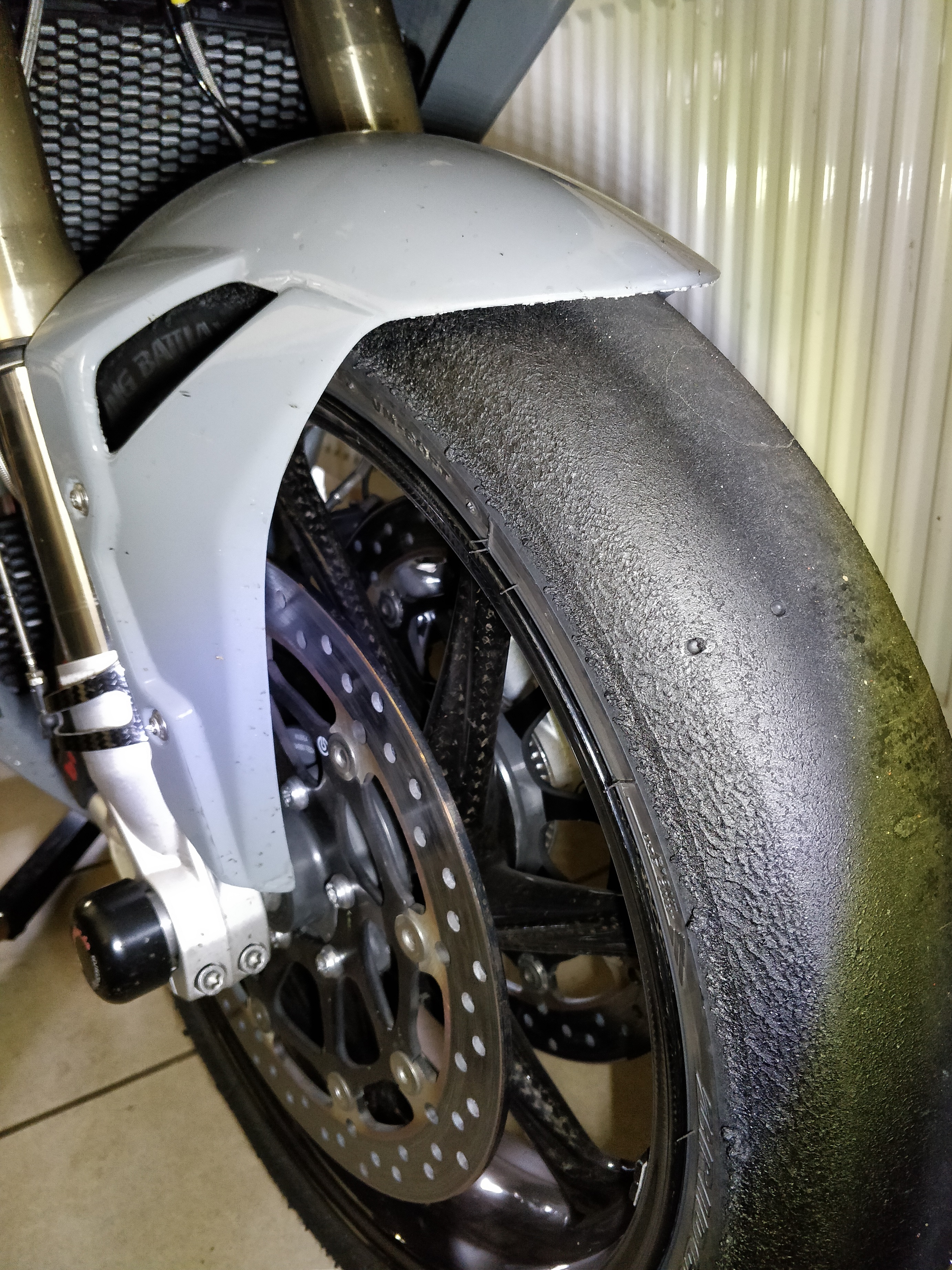 Ich hatte so ein Reifenbild erst zweimal. Einmal weil die Seriengabel an der 675 überfordert war