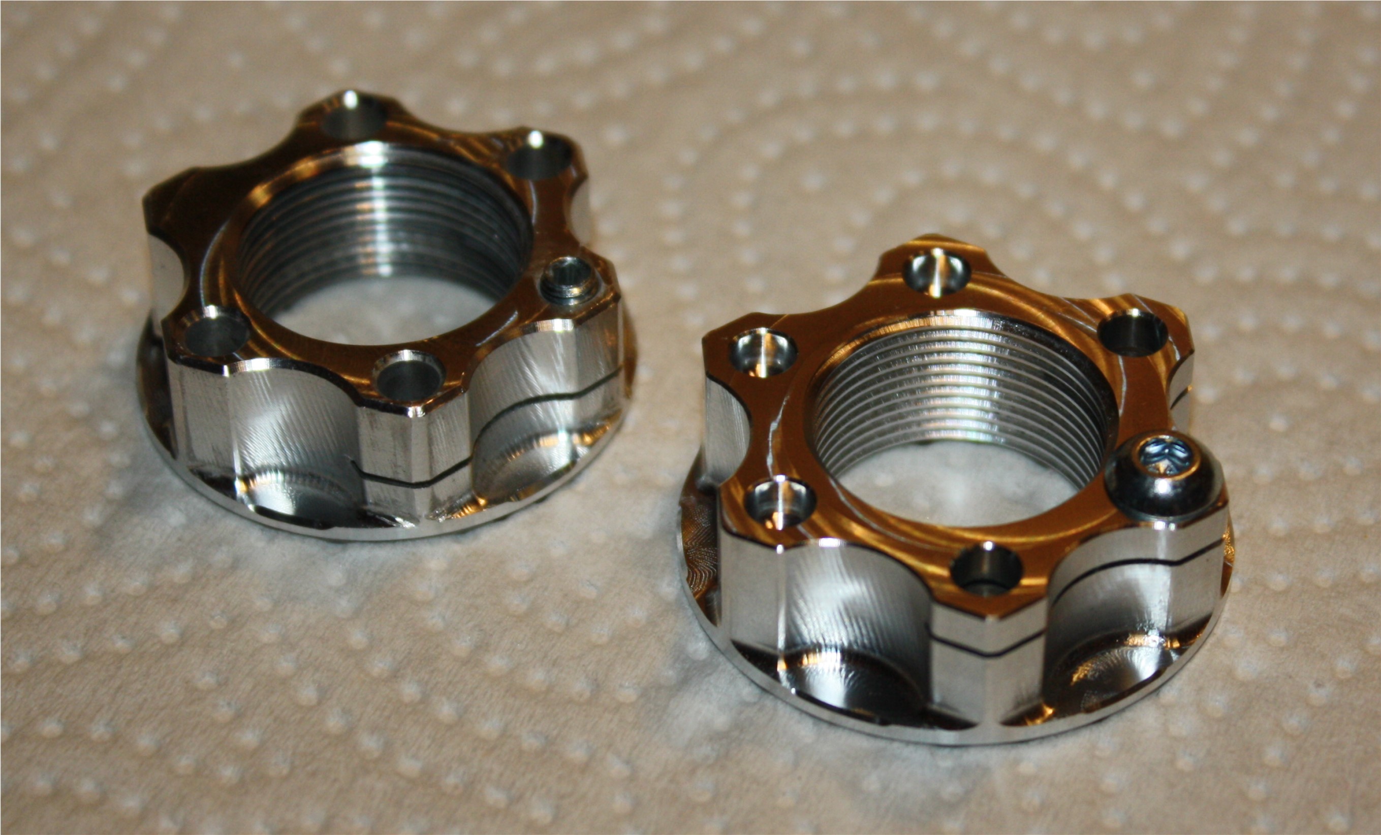 Links eine M32x1,5 Spezialmutter für die Schwingenachse der RJ15 als Ersatz für die Nutmutter.