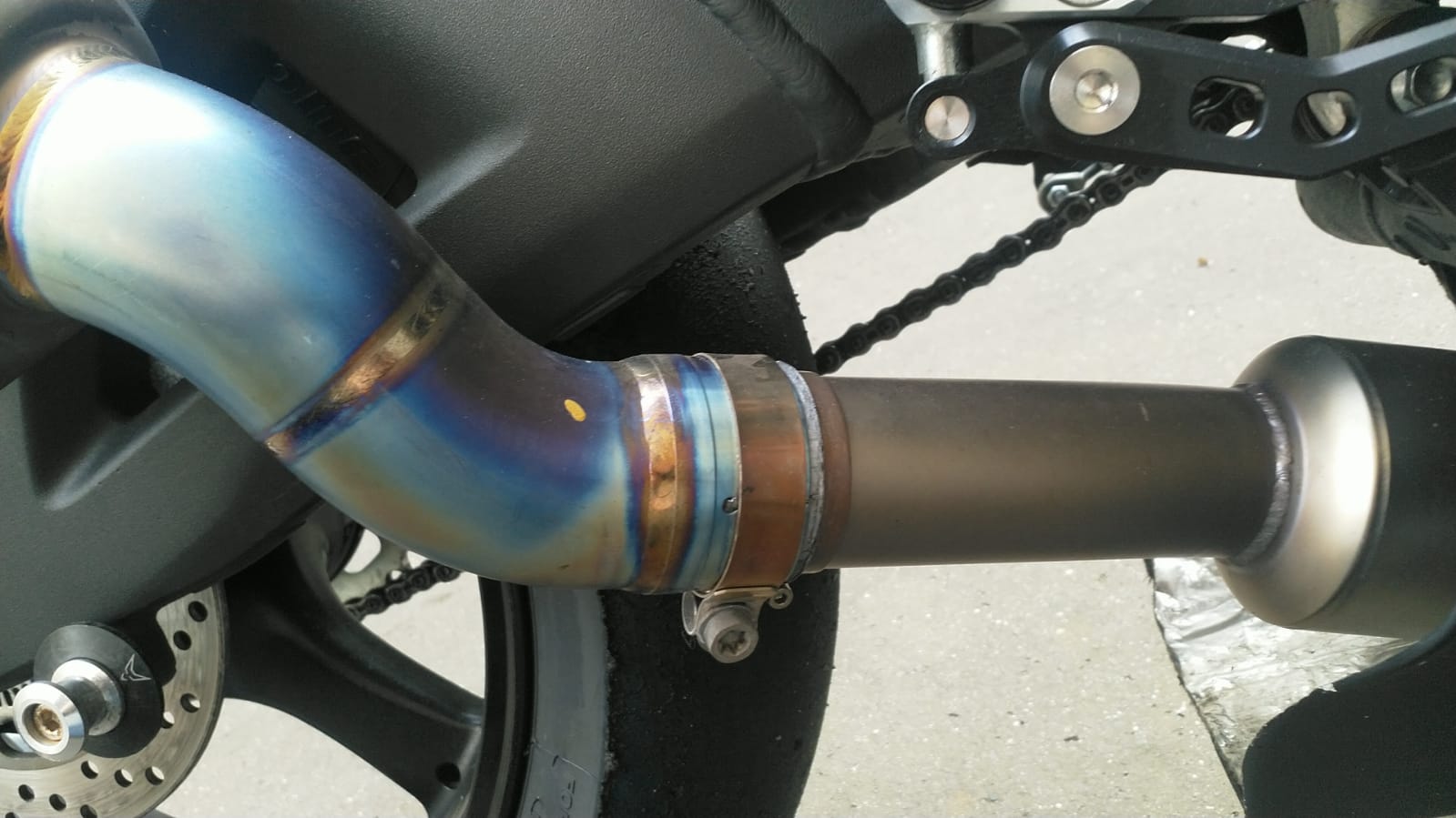 aus organisatorischen Gründen konnte ich erst heute testen ob mein neuer Endschalldämpfer (Titan Akrapovic) mit DB-Eater (60 mm) an mein Bike passt. Sollte normal passen. Aber es fehlt das Zwischenrohr, welches den Auspuff mit dem Katersatzrohr verbindet.