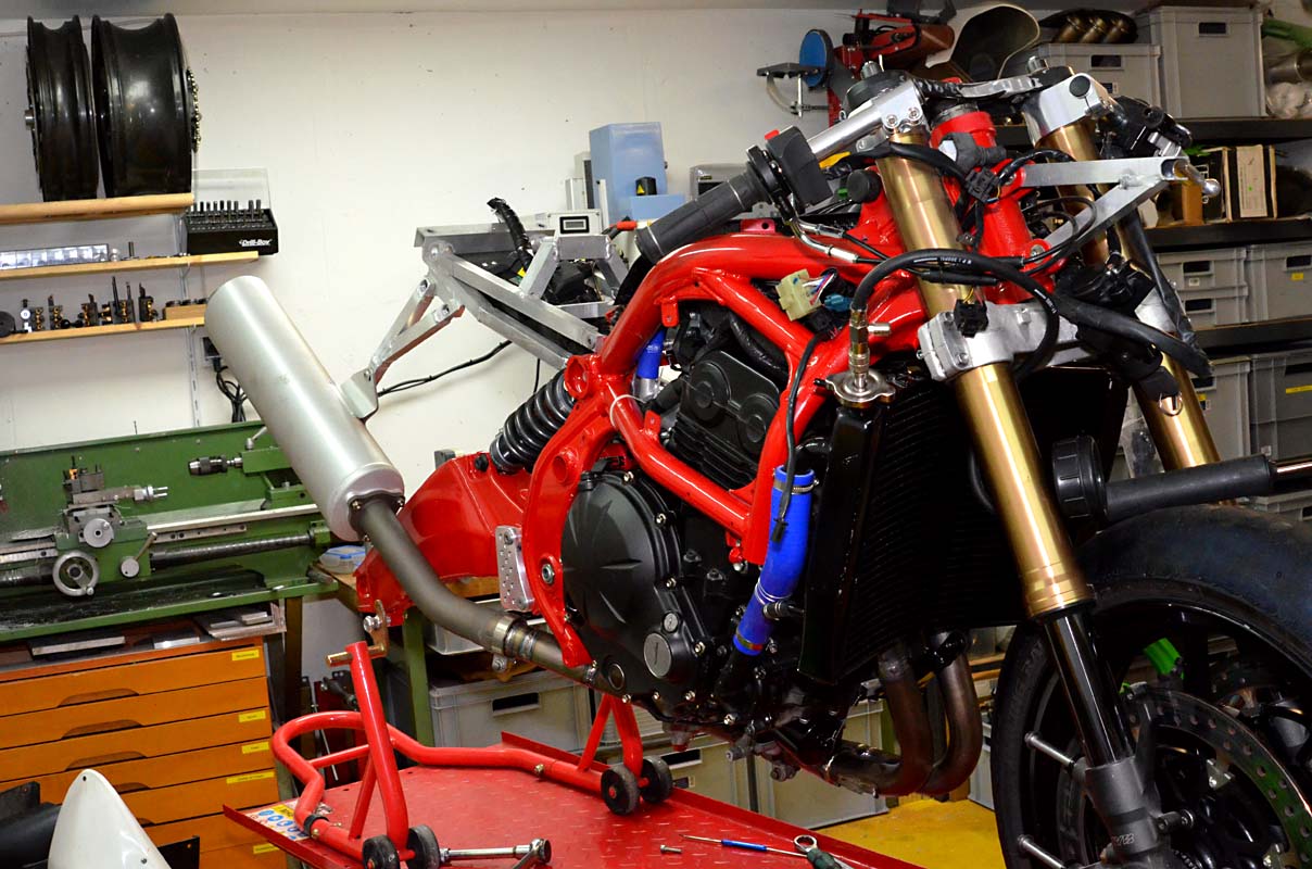 Der "Bastelständer" unter dem Motor ist weg und ein passendes Vorderrad drinnen. Eigentlich sollte das Vorderrad aus einer 2011er ZX10R rein... Reinstecken läßt es sich schon, mit 4.100 g ist es auch leichter als ein 2010er Rad,