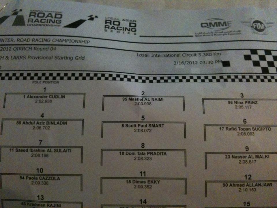 So.. NINA trainiert fleissig in KATAR und hat sich jetzt im Qualifing auf Platz drei vor Bin Ladin und BSB (Panigalefahrer) Scott Smart geschraubt.