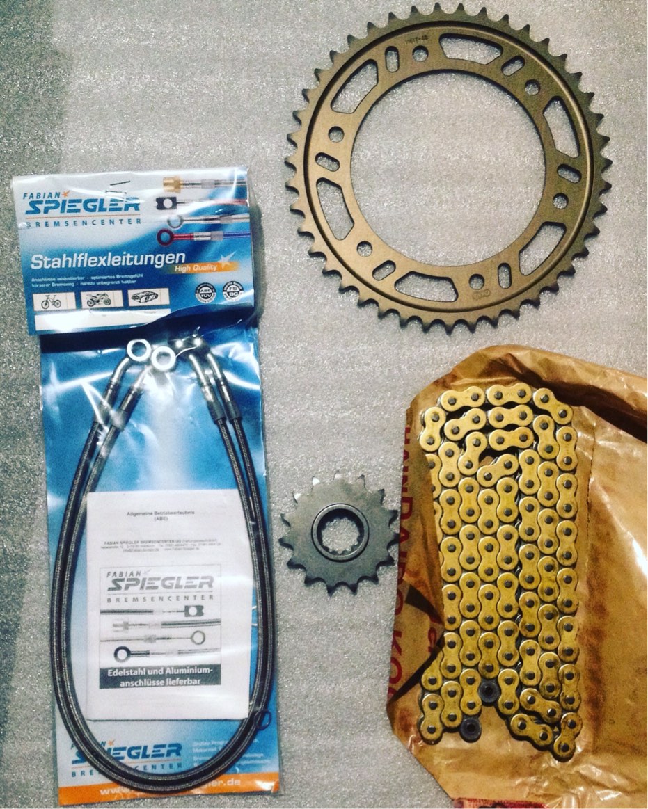 Kette, Ritzel, Kettenrad und Stahlflexbremsleitungen vorne.