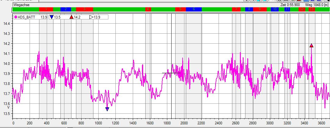 Das Bild ist von ner Runde Val de Vienne. Dabei sieht man deutlich dass auf den Geraden, also wenn Vollgas gefahren wird die Batteriespannung am niedrigsten ist. Ich gehe mal davon aus dass die Serienlichtmaschinen darauf ausgelegt sind im mittleren Drehzahlbereich die meiste Leistung > höchste Spannung zu bringen (für den Straßenbetrieb) und unten und obernraus wieder deutlich abflacht. Das würde auch die deutlich höhere Spannung bei Teillast in den Kurven erklären. Deutlich zu sehen bei 900 - 1300m, das ist die Gegengerade sowie am Anfang und Ende der Aufzeichnung (Start / Zielgerade).