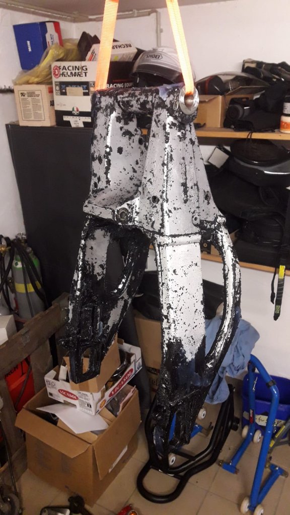 Weil der Rahmen der SRAD nicht in die Pulverbeschichtungsanlage unserer Firma passt und die Schwinge in Schwarz kam, musste eine andere Lösung her. Ich entschied mich dazu die Schwinge zu entlacken.