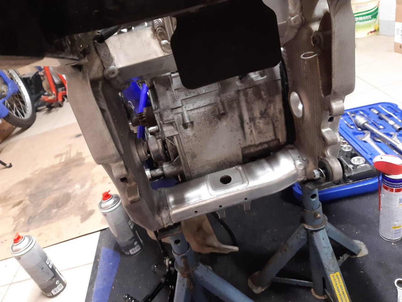 Danach ging es eigentlich ganz schnell – die originale Schwinge samt Lagerhülsen raus. Hierbei fiel auf, dass sie Schwinge vermutlich eh bald andere Wege eingeschlagen hätte, da eine Schraube der Umlenkung wohl vom Vorbesitzer gelöst und dann nicht wieder festgeschraubt wurde. Sie war nämlich kurz davor von selber herauszufallen. Das hätte böse enden können…