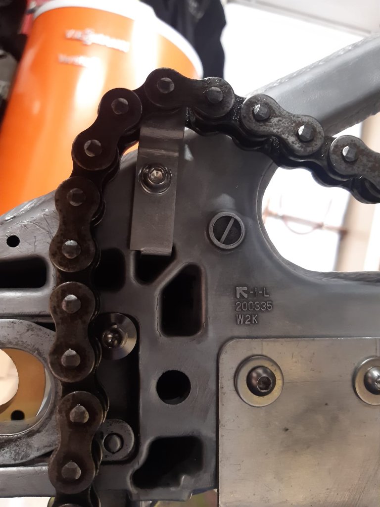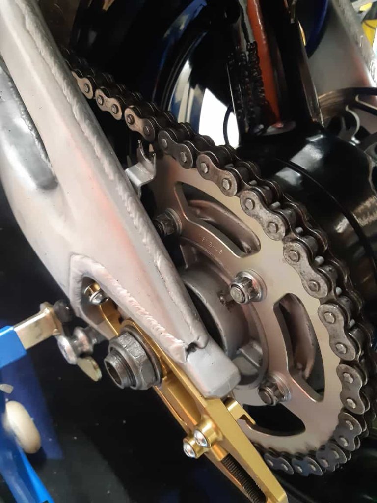 Beim Einbau der Schwinge kamen noch ein paar Details dazu. Zum Beispiel die Kettenfinne, die ich aus einem Blech angefertigt habe. Die Gewinde zum Montieren habe ich einfach selber an der Schwinge angebracht.