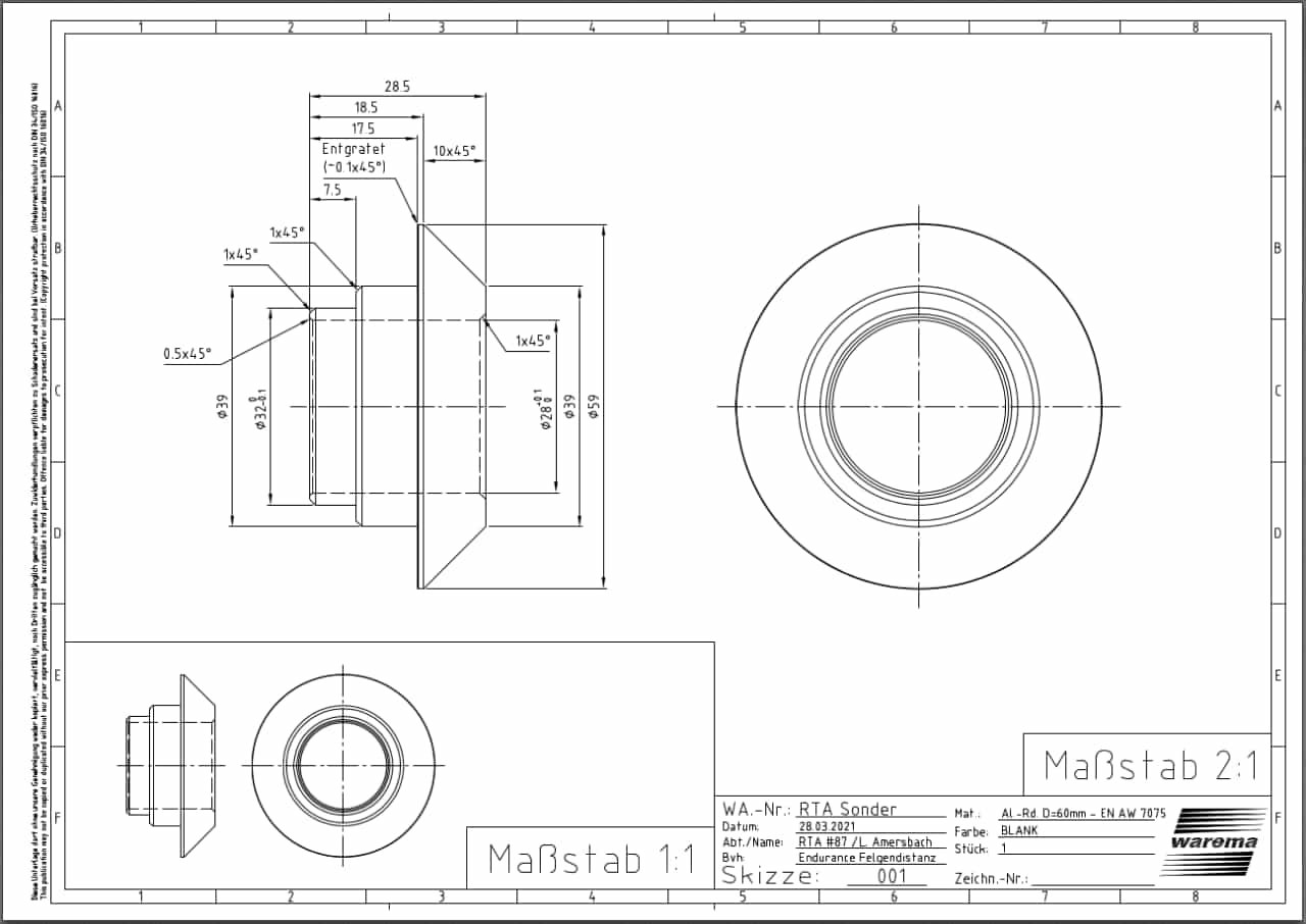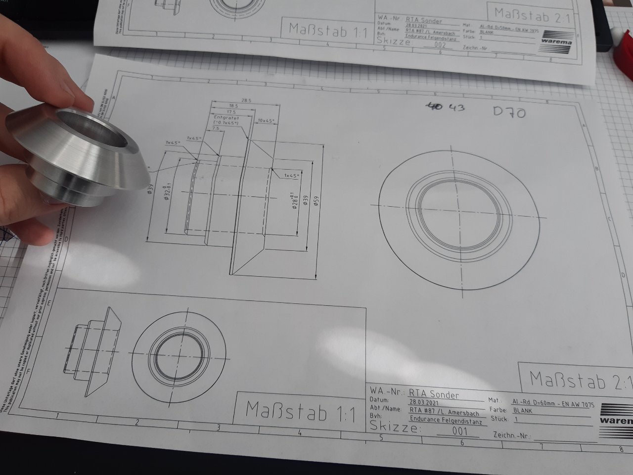 Die Lösung des Problems lag in meinen eigenen Fähigkeiten und Kontakten. Da ich zeitnah keine passenden Teile beschaffen konnte, entwarf ich diese kurzerhand einfach selber und ließ sie mir durch einen bekannten an einer CNC Drehmaschine aus AW 7075 Dura- oder im Volksmund Flugzeugaluminium anfertigen. Das Rohmaterial hierfür gibt es auf ebay.