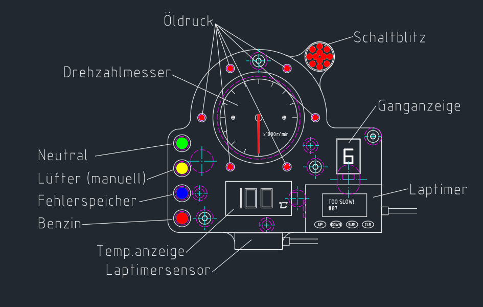 Wenden wir uns meinem größten Stolz und meiner größten Verzweiflung zu: der Elektrik. Beziehungsweise meinem Wahn von einem schönen Dashboard mit genau den Anzeigen, die ich haben wollte.
