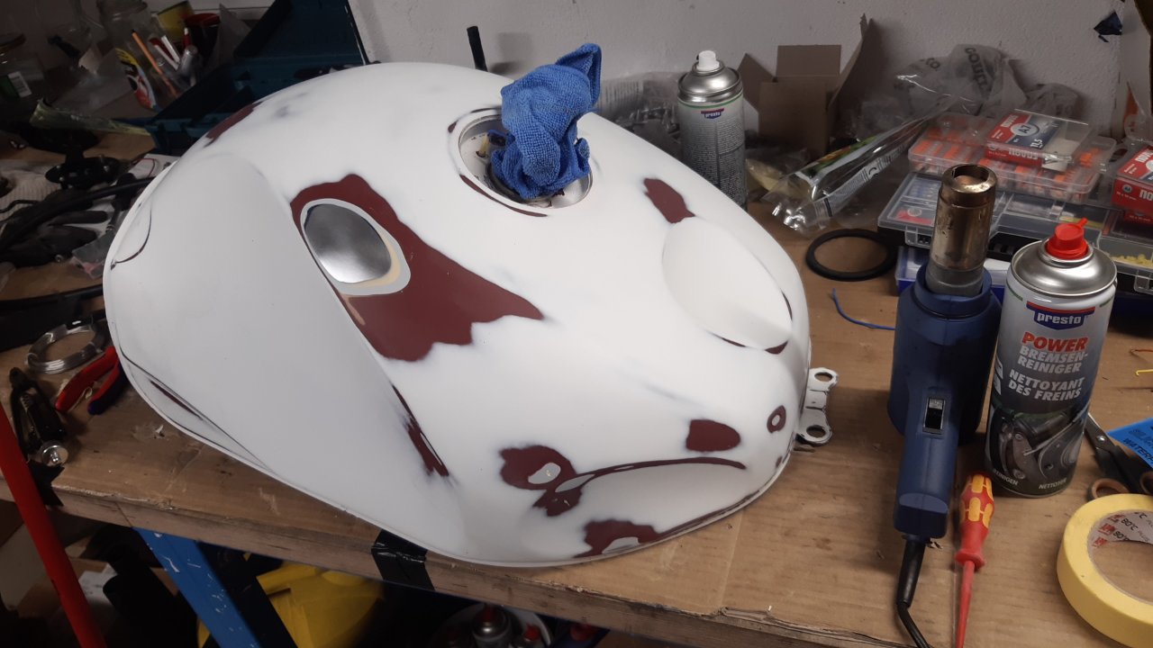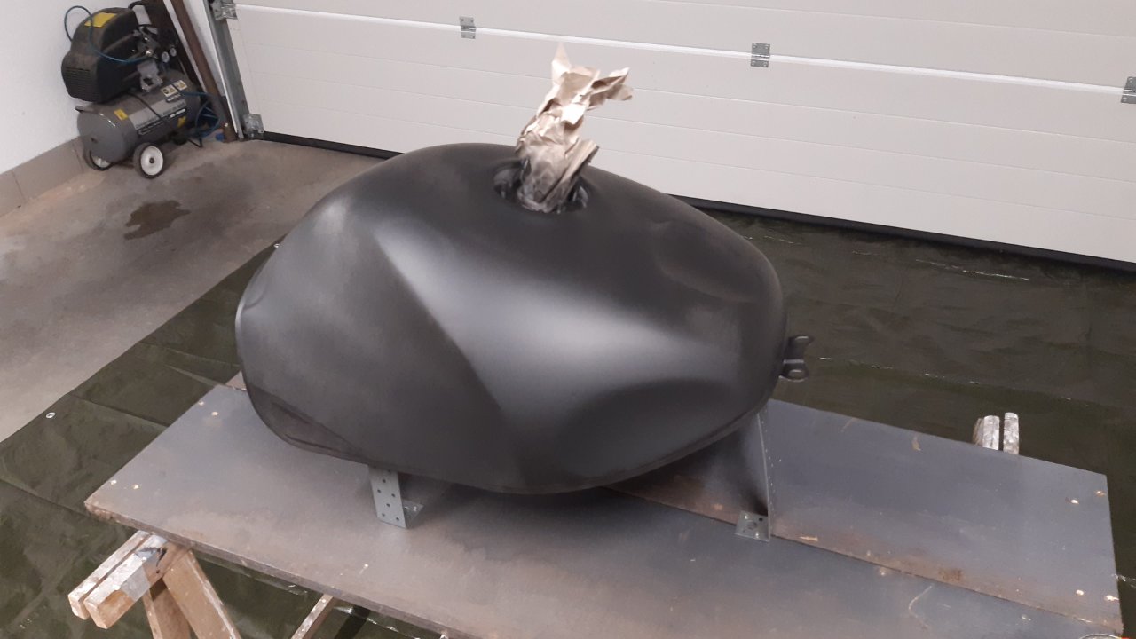 Den Tank und Verkleidung habe ich mit Black Spot Primer grundiert und anschließend mit schwarzem Metalliclack und Klarlack neu lackiert.