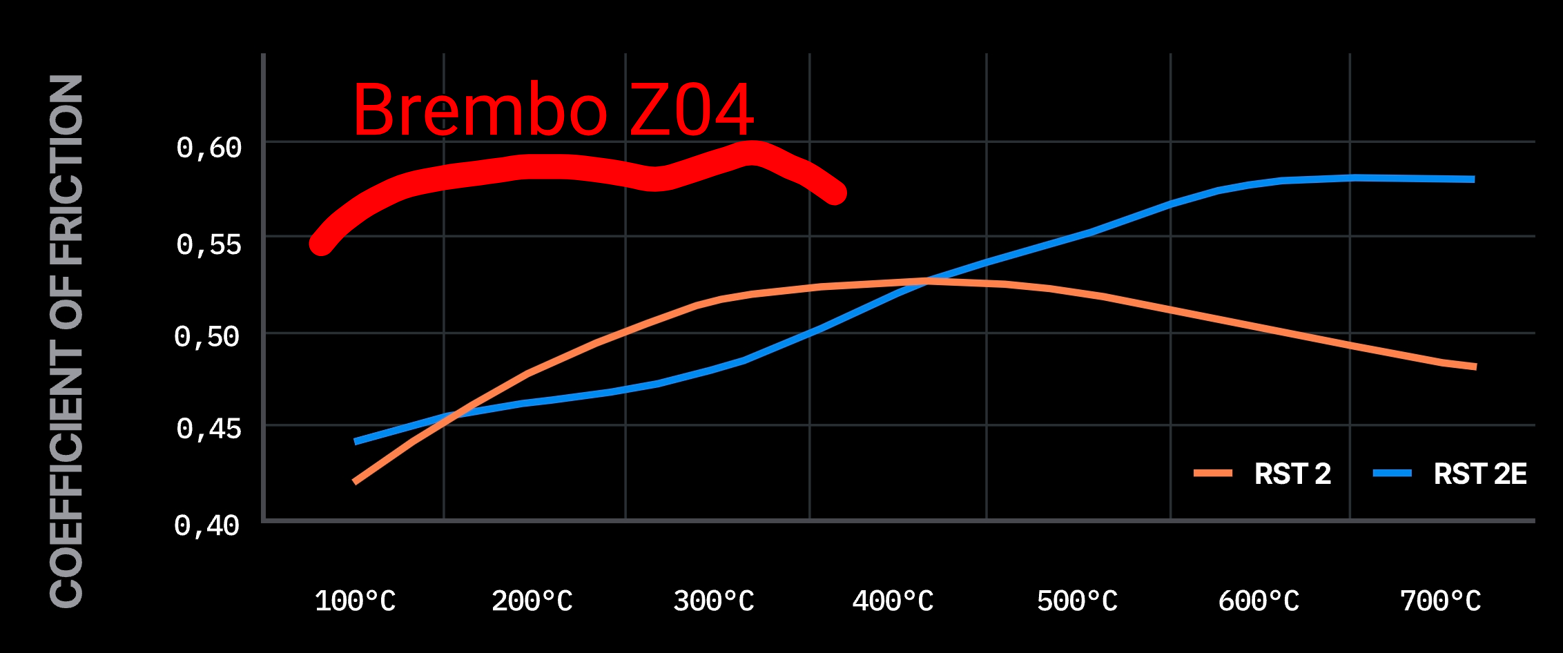 Dagegen noch die Angabe von den Brembo Z04 in rot. Für sportliche Bremsbeläge sind die echt klasse, denn von handwarm bis 400 Grad sind die ziemlich gleichmäßig. Optimal für den Hobby Bereich. Wird es heißer, geht es bergab und der Reibungs Koeffizient sinkt (wäre Brembo doof das darzustellen), wir kommen in den Fading Bereich des Bremsbelags (nicht der Bremsflüssigkeit). Und diese Frage ist für mich noch nicht schlüssig, warum soll der normale Z04 Anwender sich Titankolben einbauen? Richtiger Rennsport, keine Frage.