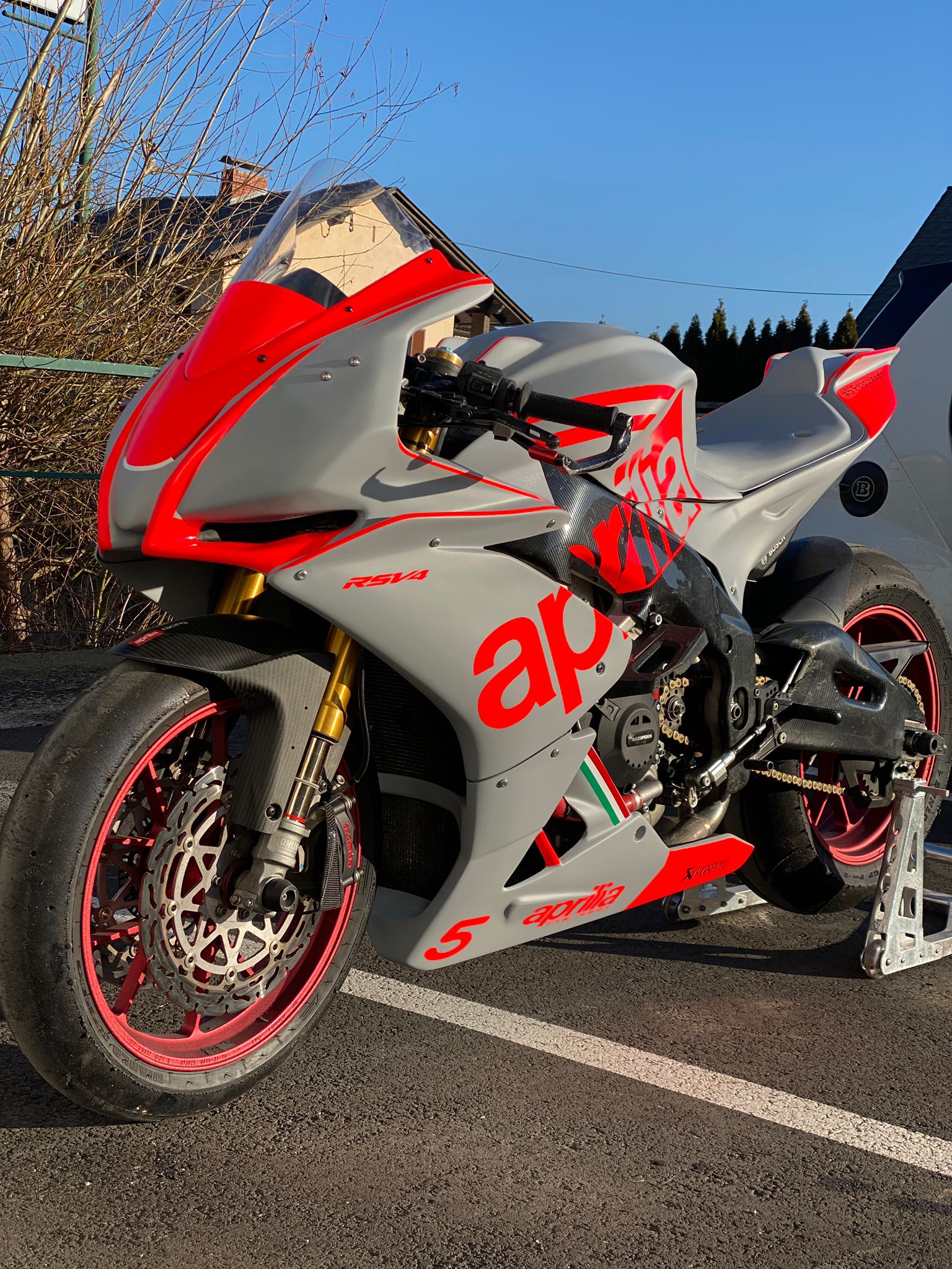 Und das nächste Teil geht raus: Aprilia in Nardo Grau Matt und Neonrot beklebt.