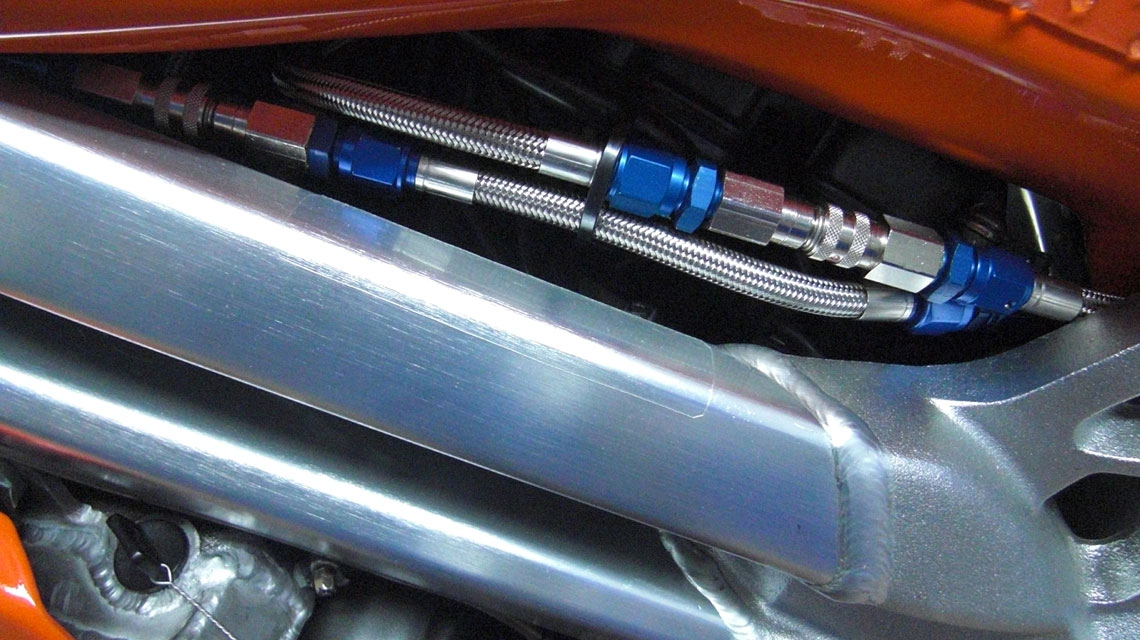 , sah das Ergebnis dann so aus. Teflonleitungen mit Stahlflex an eloxierten Fittings. Lecker.