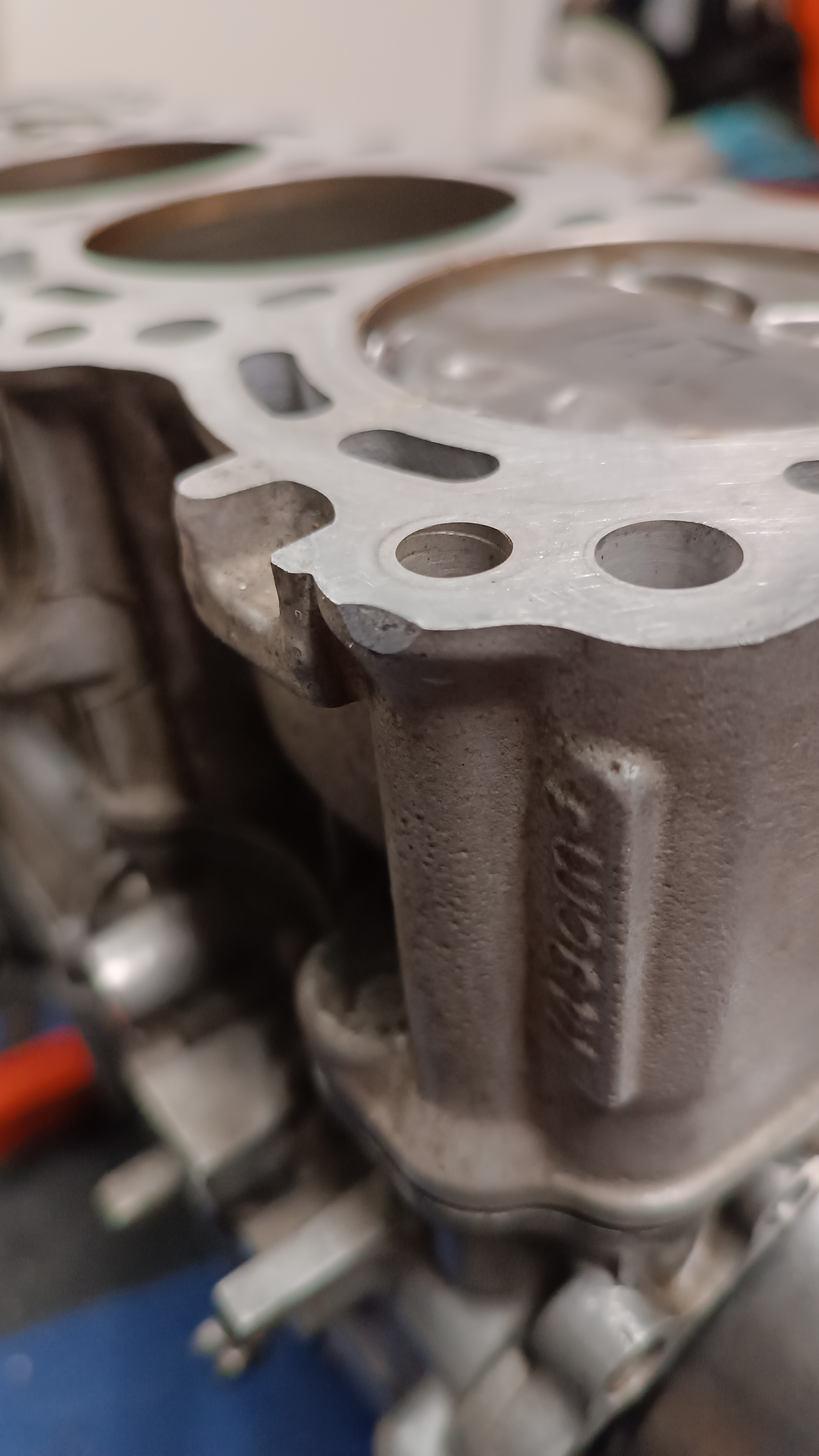 Um den Druckausgleich zwischen den Zylindern zu verbessern werden alle Hemden unten gekürzt und zwischen Zylinder 1&2 sowie 3&4 Fenster ausgefräst. Beim Quetschkante ausmessen habe ich auch gleich die tiefste Position der Kolben markiert. So konnte ich nach dem Zerlegen von unten nochmal genau nachmessen wo ich wie viel gefahrlos entfernen kann.